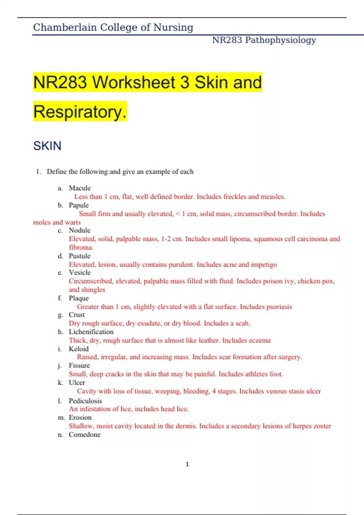 NR283 Pathophysiology Worksheet 3 Skin and Respiratory Verified Content