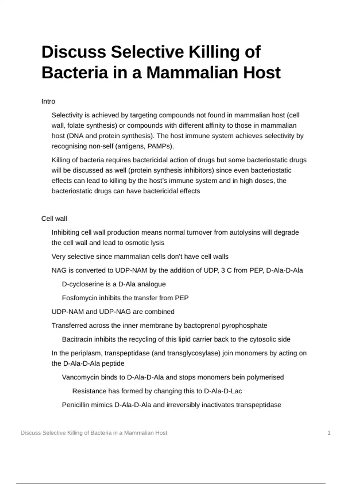 University of Cambridge (Medicine 1st class): Essay plan for 'Discuss selective killing of bacteria in a mammalian host' of MoDA (Mechanisms of Drug Action) for 2nd year.