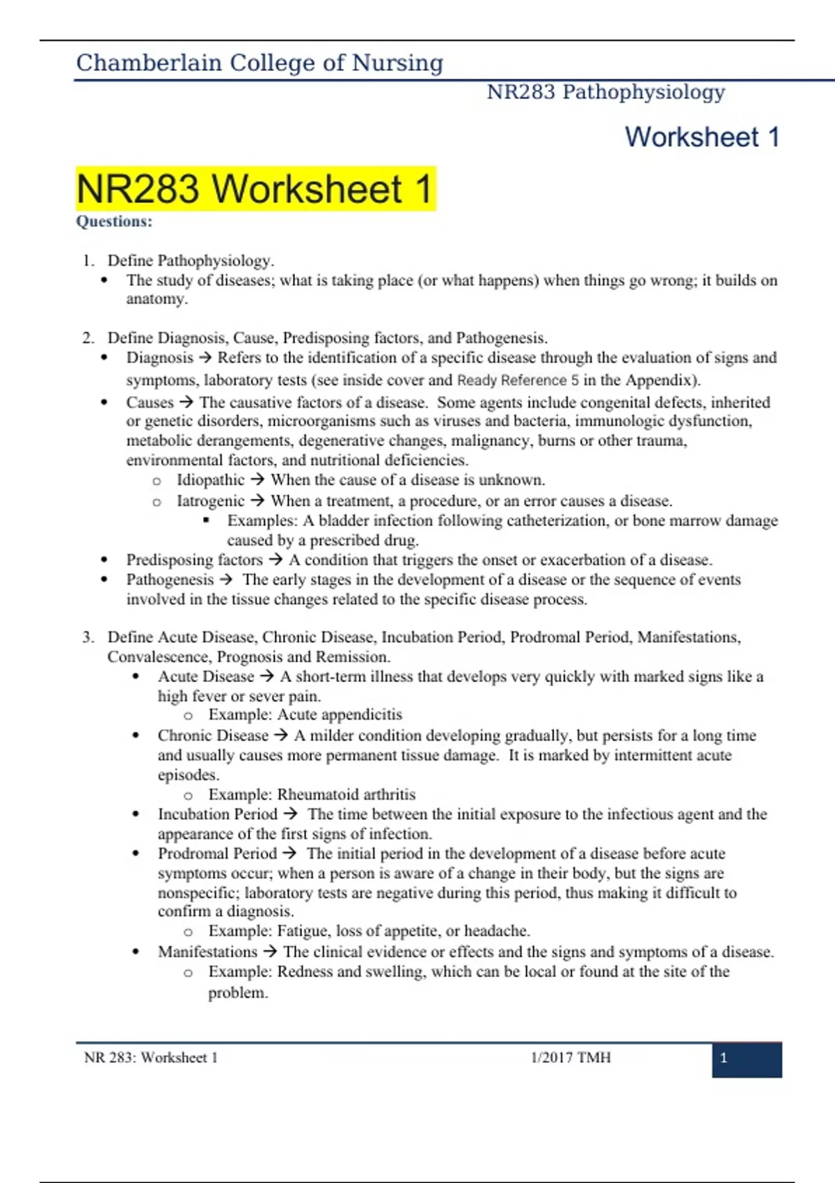 NR283 Pathophysiology Worksheet 1 (Newest 2023/2024) Verified Content