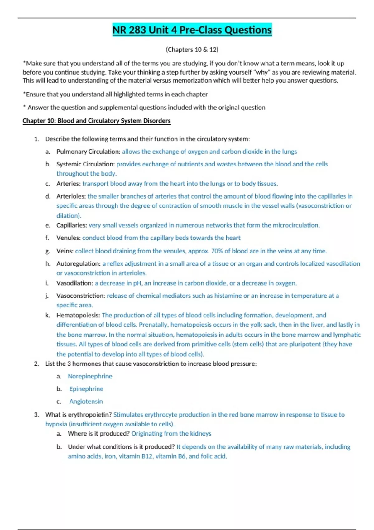 NR 283 Unit 4 Pre-Class Questions (Chapters 10 & 12) (Latest 2023/2024) Verified Answers