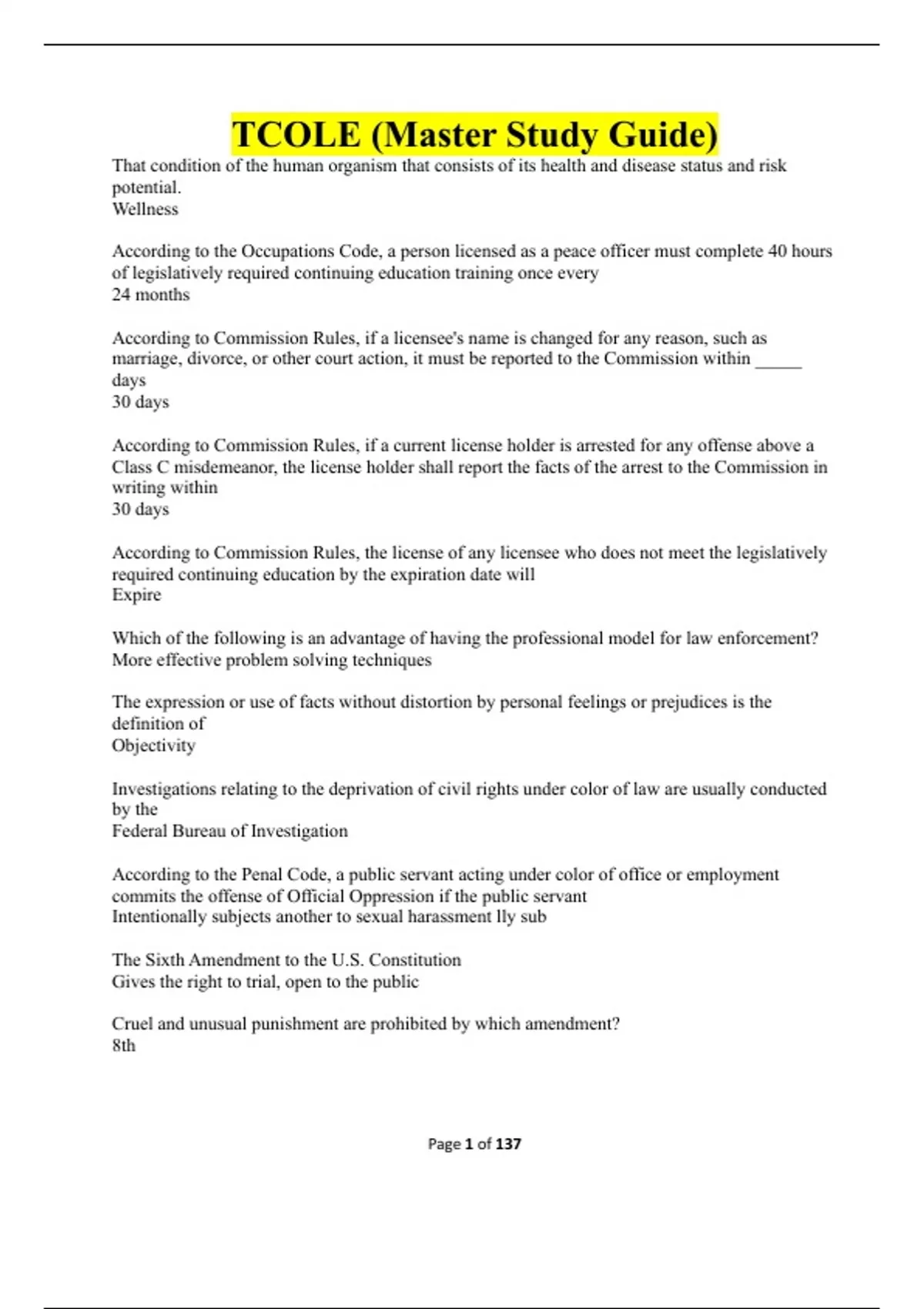 LATEST Summary The Texas Commission on Law Enforcement TCOLE (Master Study Guide)