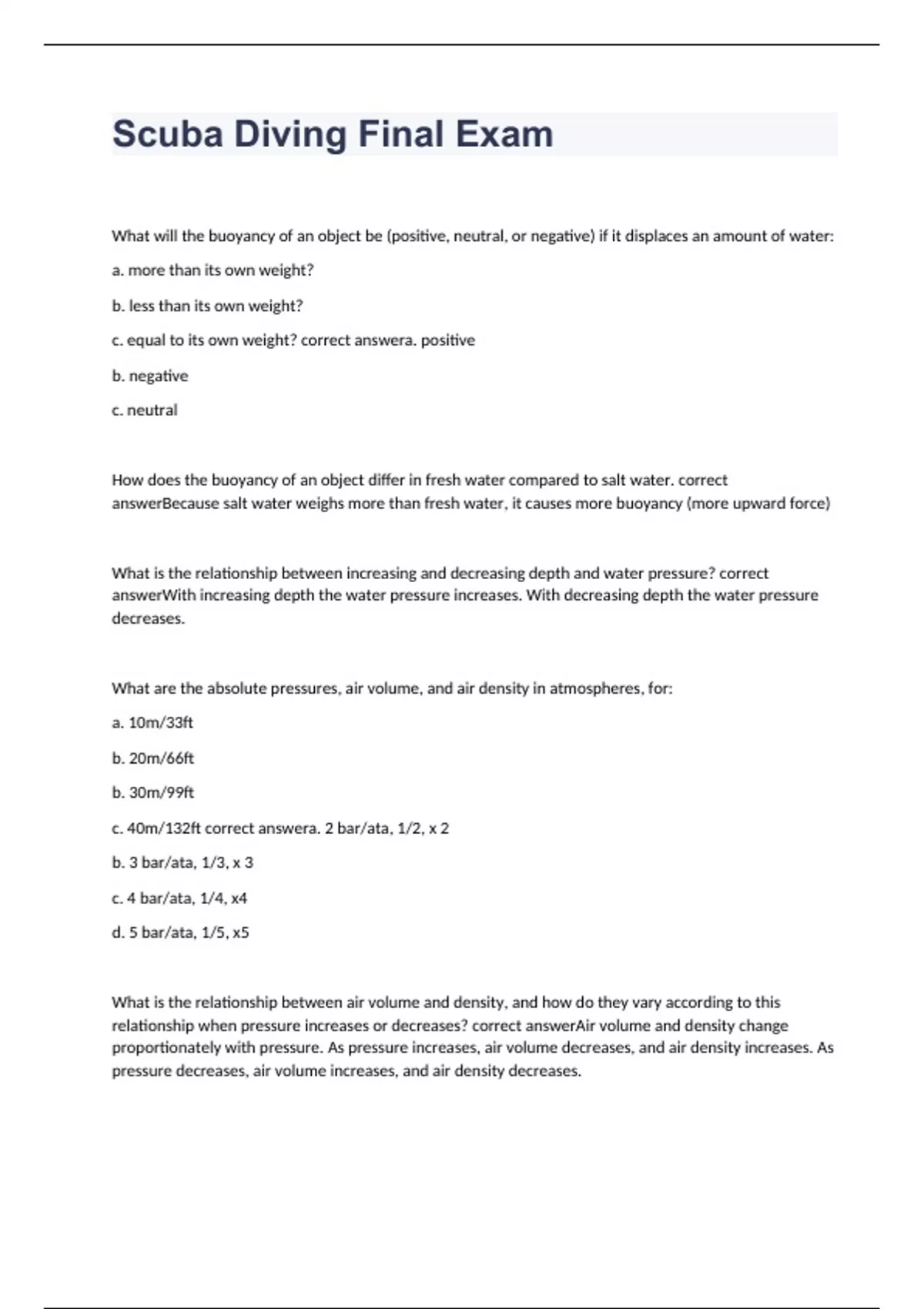 What will the buoyancy of an object be (positive, neutral, or negative) if it displaces an amount of water: a. more than its own weight? b. less than its own weight? c. equal to its own weight? a. positive b. negative c. neutral How does the buoyancy of an object differ in fresh water compared to salt water. Because salt water weighs more than fresh water, it causes more buoyancy (more upward force) What is the relationship between increasing and decreasing depth and water pressure? With increasing depth the water pressure increases. With decreasing depth the water pressure decreases. What are the absolute pressures, air volume, and air density in atmospheres, for: a. 10m/33ft b. 20m/66ft b. 30m/99ft c. 40m/132ft a. 2 bar/ata, 1/2, x 2 b. 3 bar/ata, 1/3, x 3 c. 4 bar/ata, 1/4, x4 d. 5 bar/ata, 1/5, x5 What is the relationship between air volume and density, and how do they vary according to this relationship when pressure increases or decreases? Air volume and density change proportionately with pressure. As pressure increases, air volume decreases, and air density increases. As pressure decreases, air volume increases, and air density decreases. What is a "squeeze"? A pressure imbalance that pushes tissues into an air space. What is "equalization"? The process of adding air to an air space. What are the three ways you can equalize air spaces during descent? 1. pinch your nose and blow gently against it 2. wiggling your jaw side-to-side and swallowing 3. blow air into mask through your nose How often should you equalize during descent? Frequently What three steps should you take if you feel discomfort in an air space while descending? 1. stop your descent 2. signal your buddy(ies) 3. ascend slightly until the discomfort passes and try again What is the most important rule in scuba diving? to breathe continuously and never, ever hold your breath What are the consequences of breaking the most important rule in scuba diving? lung overexpansion injuries How does increasing depth affect how long your air supply lasts? it shortens it