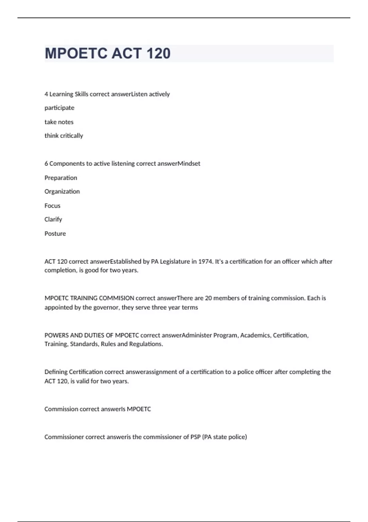 4 Learning Skills Listen actively participate take notes think critically 6 Components to active listening Mindset Preparation Organization Focus Clarify Posture ACT 120 Established by PA Legislature in 1974. It's a certification for an officer which after completion, is good for two years. MPOETC TRAINING COMMISION There are 20 members of training commission. Each is appointed by the governor, they serve three year terms POWERS AND DUTIES OF MPOETC Administer Program, Academics, Certification, Training, Standards, Rules and Regulations. Defining Certification assignment of a certification to a police officer after completing the ACT 120, is valid for two years. Commission Is MPOETC Commissioner is the commissioner of PSP (PA state police) Police Department A public agency having general police powers and charged with making arrests in connection with the enforcement of criminal or traffic laws. It includes the sheriff's office and university police. Police officer An employee assigned to criminal or traffic law enforcement Commission members 20 members,etc (SEE PAGE 13 for remaining) PSP Commissioner is chairman, Attorney General police commisioner of a city of the first class. Commission power and duties a. Administer program b. Academies c. Certification d. Training e. Standards f. Rules and regulations