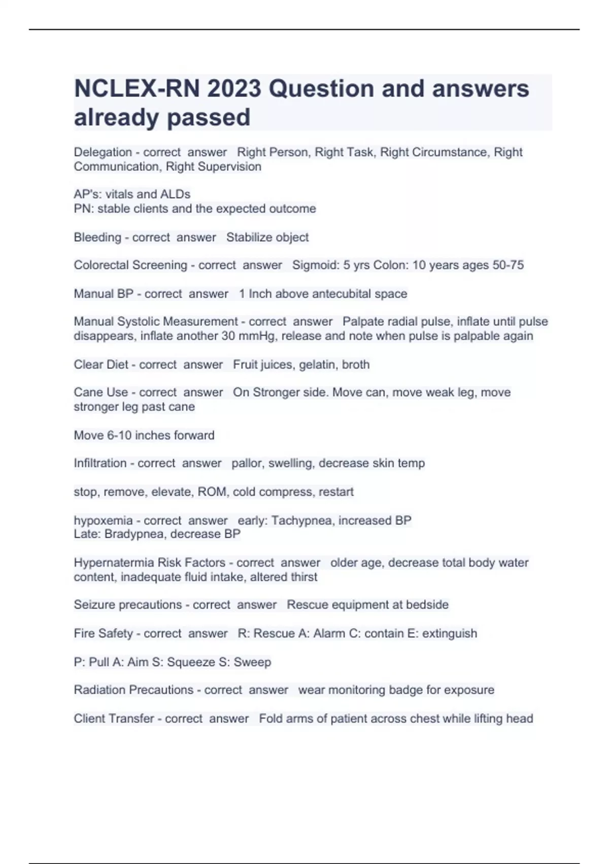 NCLEX-RN 2023 Question and answers already passed Delegation - correct answer Right Person, Right Task, Right Circumstance, Right Communication, Right Supervision AP's: vitals and ALDs PN: stable clients and the expected outcome Bleeding - correct answer Stabilize object Colorectal Screening - correct answer Sigmoid: 5 yrs Colon: 10 years ages 50-75 Manual BP - correct answer 1 Inch above antecubital space Manual Systolic Measurement - correct answer Palpate radial pulse, inflate until pulse disappears, inflate another 30 mmHg, release and note when pulse is palpable again Clear Diet - correct answer Fruit juices, gelatin, broth Cane Use - correct answer On Stronger side. Move can, move weak leg, move stronger leg past cane Move 6-10 inches forward Infiltration - correct answer pallor, swelling, decrease skin temp stop, remove, elevate, ROM, cold compress, restart hypoxemia - correct answer early: Tachypnea, increased BP Late: Bradypnea, decrease BP Hypernatermia Risk Factors - correct answer older age, decrease total body water content, inadequate fluid intake, altered thirst Seizure precautions - correct answer Rescue equipment at bedside Fire Safety - correct answer R: Rescue A: Alarm C: contain E: extinguish P: Pull A: Aim S: Squeeze S: Sweep