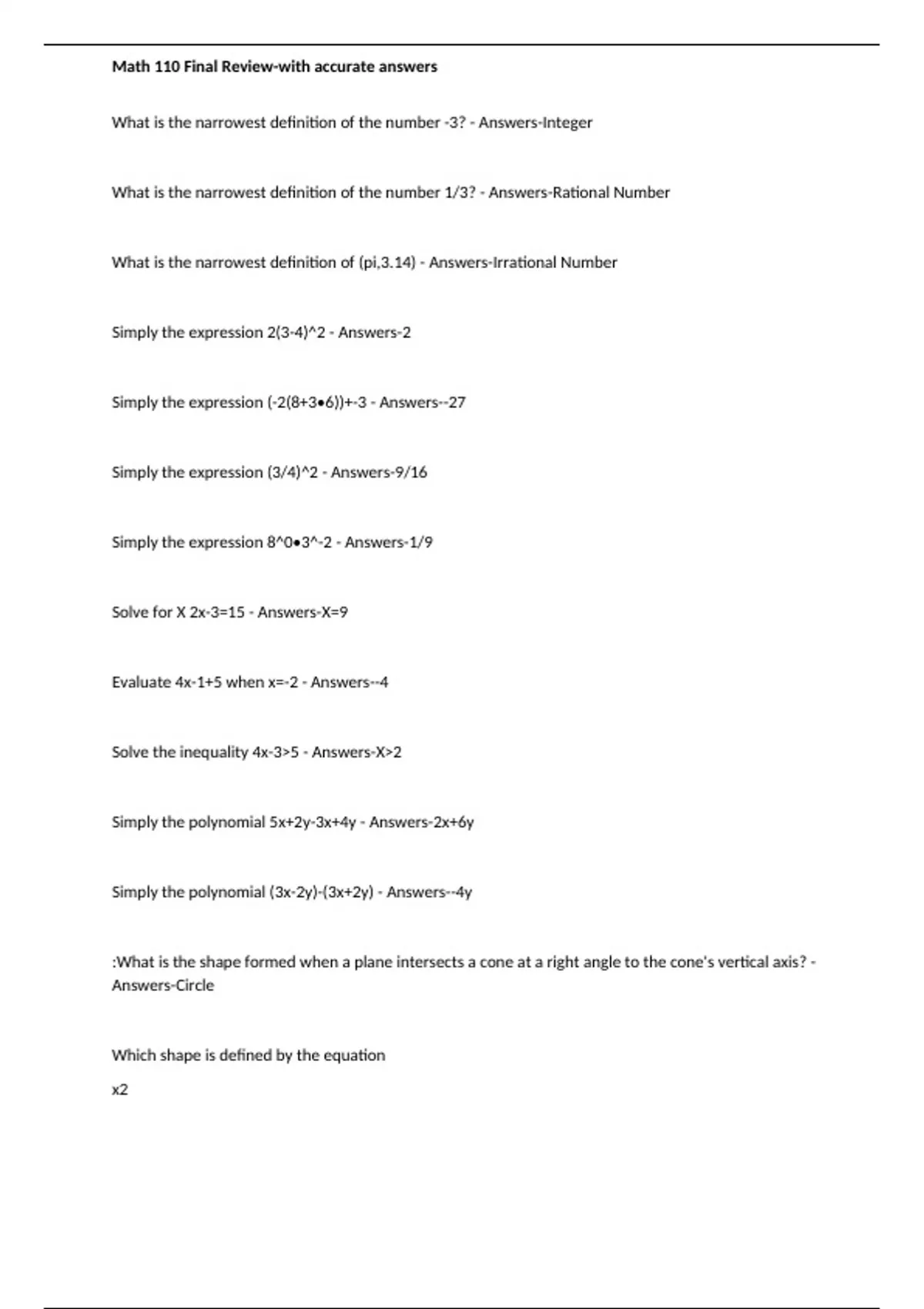 Math 110 Final Review-with accurate answers