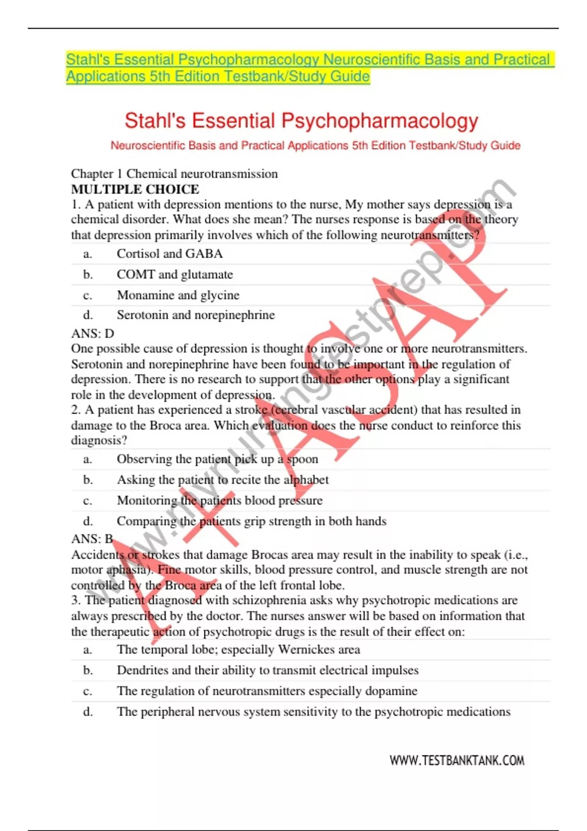 Stahl's Essential Psychopharmacology Neuroscientific Basis and Practical Applications 5th Edition Testbank/Study Guide Chapter 1 Chemical neurotransmission MULTIPLE CHOICE 1. A patient with depression mentions to the nurse, My mother says depression is a chemical disorder. What does she mean? The nurses response is based on the theory that depression primarily involves which of the following neurotransmitters? a. Cortisol and GABA b. COMT and glutamate c. Monamine and glycine d. Serotonin and norepinephrine ANS: D One possible cause of depression is thought to involve one or more neurotransmitters. Serotonin and norepinephrine have been found to be important in the regulation of depression. There is no research to support that the other options play a significant role in the development of depression. 2. A patient has experienced a stroke (cerebral vascular accident) that has resulted in damage to the Broca area. Which evaluation does the nurse conduct to reinforce this diagnosis? a. Observing the patient pick up a spoon b. Asking the patient to recite the alphabet c. Monitoring the patients blood pressure d. Comparing the patients grip strength in both hands