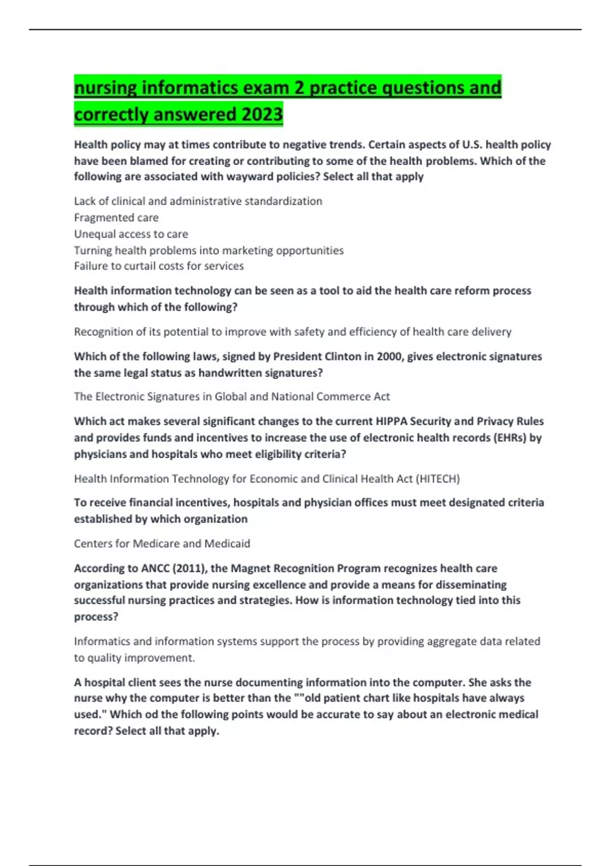 nursing informatics exam 2 practice questions and correctly answered 2023