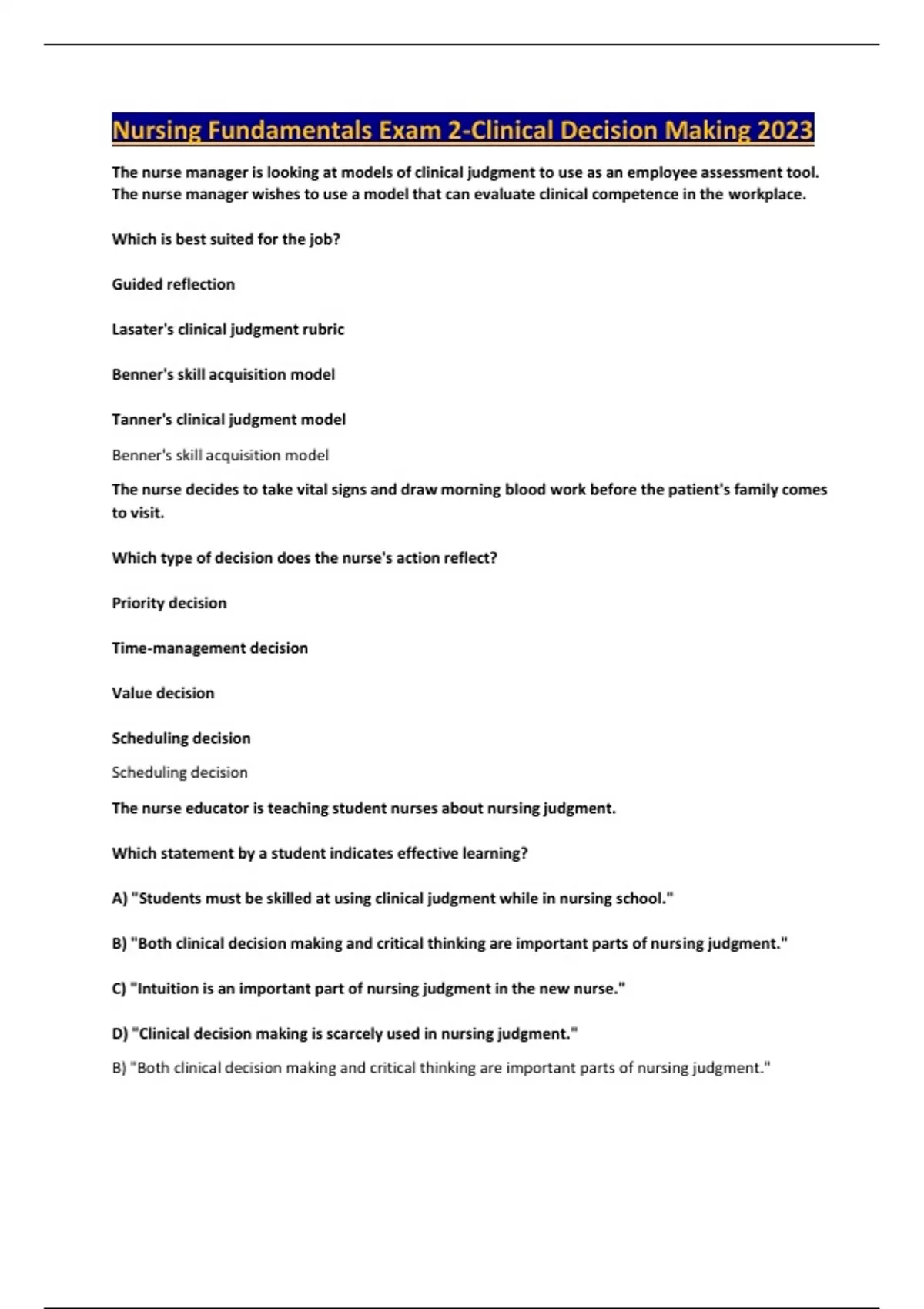 Nursing Fundamentals Exam 2-Clinical Decision Making 2023