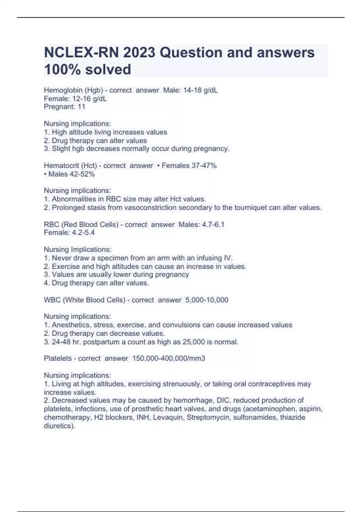 NCLEX-RN 2023 Question and answers 100% solved Hemoglobin (Hgb) - correct answer Male: 14-18 g/dL Female: 12-16 g/dL Pregnant: 11 Nursing implications: 1. High altitude living increases values 2. Drug therapy can alter values 3. Slight hgb decreases normally occur during pregnancy. Hematocrit (Hct) - correct answer • Females 37-47% • Males 42-52% Nursing implications: 1. Abnormalities in RBC size may alter Hct values. 2. Prolonged stasis from vasoconstriction secondary to the tourniquet can alter values. RBC (Red Blood Cells) - correct answer Males: 4.7-6.1 Female: 4.2-5.4 Nursing Implications: 1. Never draw a specimen from an arm with an infusing IV. 2. Exercise and high altitudes can cause an increase in values. 3. Values are usually lower during pregnancy 4. Drug therapy can alter values. WBC (White Blood Cells) - correct answer 5,000-10,000 Nursing implications: 1. Anesthetics, stress, exercise, and convulsions can cause increased values 2. Drug therapy can decrease values. 3. 24-48 hr. postpartum a count as high as 25,000 is normal. Platelets - correct answer 150,000-400,000/mm3 Nursing implications: 1. Living at high altitudes, exercising strenuously, or taking oral contraceptives may increase values. 2. Decreased values may be caused by hemorrhage, DIC, reduced production of platelets, infections, use of prosthetic heart valves, and drugs (acetaminophen, aspirin, chemotherapy, H2 blockers, INH, Levaquin, Streptomycin, sulfonamides, thiazide diuretics).
