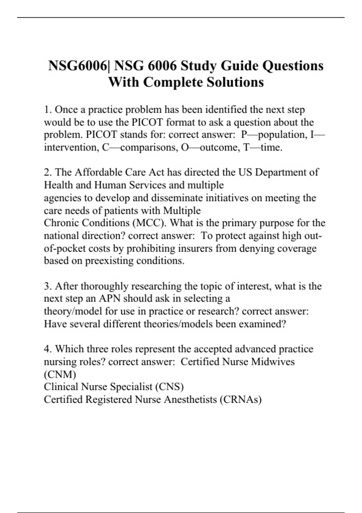 1. Once a practice problem has been identified the next step would be to use the PICOT format to ask a question about the problem. PICOT stands for: correct answer: P—population, I—intervention, C—comparisons, O—outcome, T—time. 2. The Affordable Care Act has directed the US Department of Health and Human Services and multiple agencies to develop and disseminate initiatives on meeting the care needs of patients with Multiple Chronic Conditions (MCC). What is the primary purpose for the national direction? correct answer: To protect against high out-of-pocket costs by prohibiting insurers from denying coverage based on preexisting conditions. 3. After thoroughly researching the topic of interest, what is the next step an APN should ask in selecting a theory/model for use in practice or research? correct answer: Have several different theories/models been examined? 4. Which three roles represent the accepted advanced practice nursing roles? correct answer: Certified Nurse Midwives (CNM) Clinical Nurse Specialist (CNS) Certified Registered Nurse Anesthetists (CRNAs) 5. What are the three major categories of Nola Pender's Health promotion model? correct answer: Beha