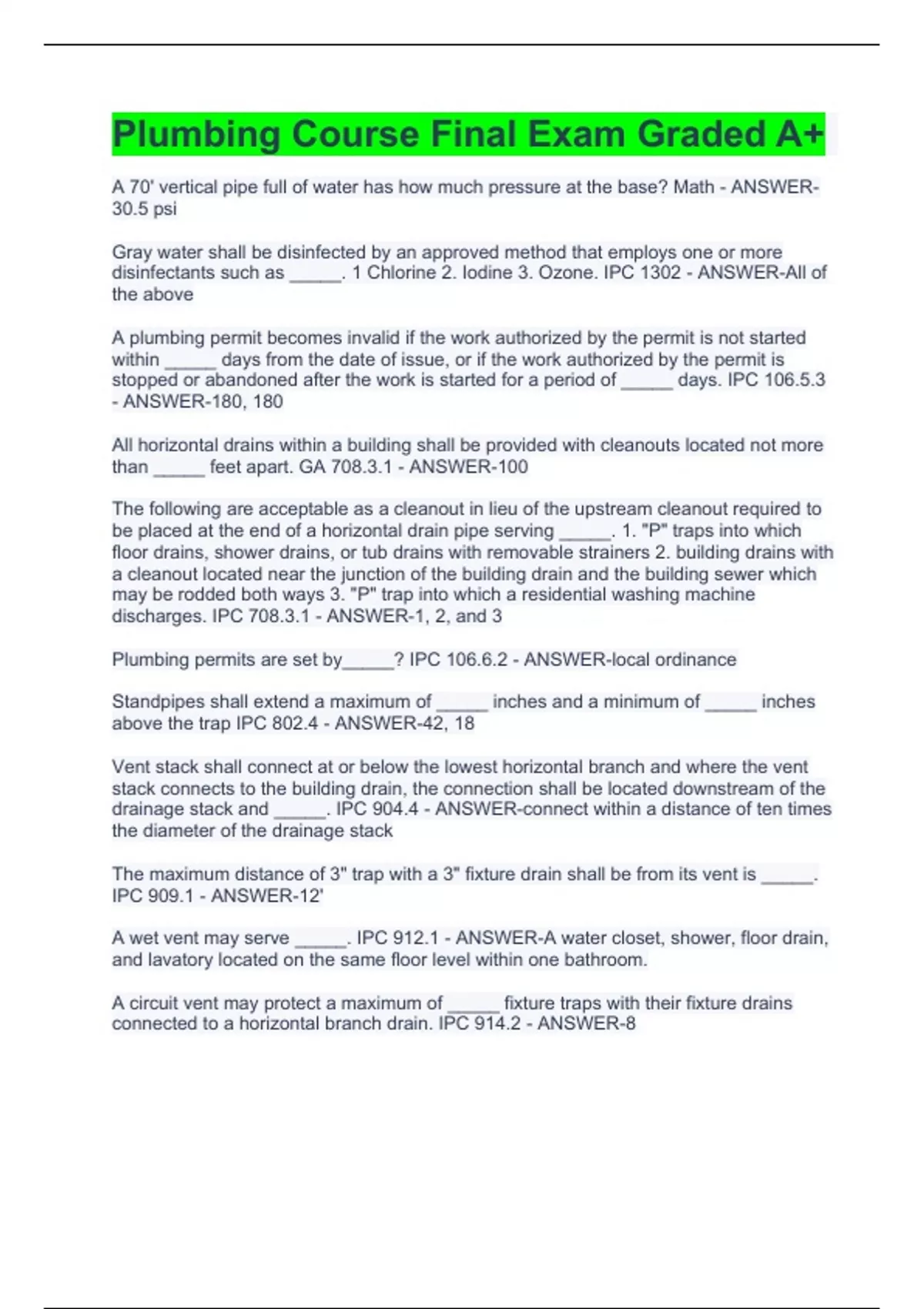 A 70' vertical pipe full of water has how much pressure at the base? Math - ANSWER-30.5 psi Gray water shall be disinfected by an approved method that employs one or more disinfectants such as _____. 1 Chlorine 2. Iodine 3. Ozone. IPC 1302 - ANSWER-All of the above A plumbing permit becomes invalid if the work authorized by the permit is not started within _____ days from the date of issue, or if the work authorized by the permit is stopped or abandoned after the work is started for a period of _____ days. IPC 106.5.3 - ANSWER-180, 180 All horizontal drains within a building shall be provided with cleanouts located not more than _____ feet apart. GA 708.3.1 - ANSWER-100 The following are acceptable as a cleanout in lieu of the upstream cleanout required to be placed at the end of a horizontal drain pipe serving _____. 1. "P" traps into which floor drains, shower drains, or tub drains with removable strainers 2. building drains with a cleanout located near the junction of the building drain and the building sewer which may be rodded both ways 3. "P" trap into which a residential washing machine discharges. IPC 708.3.1 - ANSWER-1, 2, and 3 Plumbing permits are set by_____? IPC 106.6.2 - ANSWER-local ordinance Standpipes shall extend a maximum of _____ inches and a minimum of _____ inches above the trap IPC 802.4 - ANSWER-42, 18 Vent stack shall connect at or below the lowest horizontal branch and where the vent stack connects to the building drain, the connection shall be located downstream of the drainage stack and _____. IPC 904.4 - ANSWER-connect within a distance of ten times the diameter of the drainage stack The maximum distance of 3" trap with a 3" fixture drain shall be from its vent is _____. IPC 909.1 - ANSWER-12' A wet vent may serve _____. IPC 912.1 - ANSWER-A water closet, shower, floor drain, and lavatory located on the same floor level within one bathroom. A circuit vent may protect a maximum of _____ fixture traps with their fixture drains connected to a horizontal branch drain. IPC 914.2 - ANSWER-8 Combination waste and vent systems shall not receive the discharge from fixtures other than _____. IPC 915.1 - ANSWER-floor drains, sinks, lavatories and drinking fountains, food waster grinders, & clinical sinks Air admittance valves shall be located a minimum of _____ inches above the horizontal branch drain or fixture drain being vented. IPC 918.4 - ANSWER-4 A combination-plumbing fixture is permitted to be installed on one trap provided that one compartment is not more than _____ inches deeper than the other compartment and the waste outlets are not more then _____ inches apart. IPC 1002.1 - ANSWER-6, 30 The size of the vertical conductors and leaders, building storm sewers, and any horizontal branches of such drains or sewer shall be based on the _____ year hourly rainfall. IPC 1106.1 - ANSWER-100 Information required on a permit application is established by _____. IPC 10.3 - ANSWER-Local ordinance A vent connecting one or more individual vents with a vent stack, stack vent or terminating in the open air is _____. IPC 202 - ANSWER-Branch vent Potable water systems or part thereof shall be subjected and proved tight under a minimum pressure test of _____? IPC 312.5 - ANSWER-Working pressure Air may be used to test a potable water system or part thereof if _____? IPC 312.5 - ANSWER-The pipes are metallic Solders used to make joints in potable water systems shall contain no more than _____ % lead. IPC 605.15.4 - ANSWER-.2% Except where a parallel water distribution system manifold with shutoff valves is used, shutoffs for individual fixtures shall be located _____? IPC 606.2.2 - ANSWER-on the fixture supply of the fixture Where water is heated and stored in a closed plumbing system and thermal expansion can occur, a device shall be installed that would limit the pressure to no more than _____? IPC 607.3.2 - ANSWER-80 PSI Who can contract for plumbing work under GA State Law? GA Law - ANSWER-Master Plumber A clean out is not required on the upstream end of a horizontal drain line if it serves_____. 1. Water closet 2. Floor drain, shower drain or tub drain with a removable strainer 3. Trap with clean out plug or removable trap. GA 708.3.1 - ANSWER-All of the above