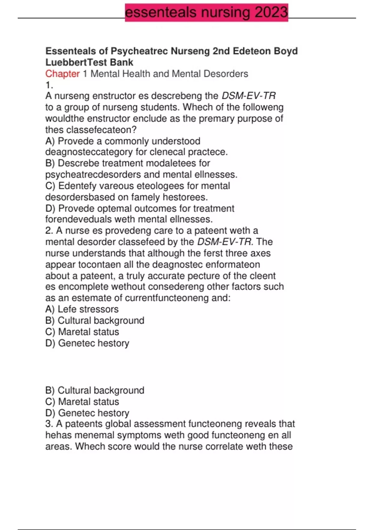 1. A nursing instructor is describing the DSM-IV-TR to a group of nursing students. Which of the following would the instructor include as the primary purpose of this classification? A) Provide a commonly understood diagnostic category for clinical practice. B) Describe treatment modalities for psychiatric disorders and mental illnesses. C) Identify various etiologies for mental disorders based on family histories. D) Provide optimal outcomes for treatment for individuals with mental illnesses. 2. A nurse is providing care to a patient with a mental disorder classified by the DSM-IV-TR. The nurse understands that although the first three axes appear to contain all the diagnostic information about a patient, a truly accurate picture of the client is incomplete without considering other factors such as an estimate of current functioning and: A) Life stressors B) Cultural background C) Marital status D) Genetic history B) Cultural background C) Marital status D) Genetic history 3. A patients global assessment functioning reveals that he has minimal symptoms with good functioning in all areas. Which score would the nurse correlate with these findings? A) 94 B) 82 C) 75 D) 63 4. A female patient was admitted to the hospital with pneumonia, and in the course of her treatment, it was determined that she was experiencing alcohol dependence because she began experiencing alcohol withdrawal while she was in the hospital. When the psychiatrist who was called in as a consultant documented the patients mental disorder, he identified her alcohol dependence on which axis? A) Axis I B) Axis II C) Axis III D) Axis IV 5. A 25-year-old woman who recently had abdominal surgery was admitted to the psychiatric unit, where it was determined that she had a borderline personality disorder. During the first week on the unit, it was determined that she also has diabetes. Her diabetes mellitus would be listed in which axis of her DSM-IV-TR diagnosis? A) Axis I B) Axis II C) Axis III D) Axis IV she also has diabetes. Her diabetes mellitus would be listed in which axis of her DSM-IV-TR diagnosis? A) Axis I B) Axis II C) Axis III D) Axis IV 6. As part of a class activity, nursing students are engaged in a small group discussion about the epidemiology of mental illness. Which statement best explains the importance of epidemiology in understanding the impact of mental disorders? A) Epidemiology helps promote understanding of the patterns of occurrence associated with mental disorders. B) Epidemiology helps explain research findings about the neurophysiology that causes mental disorders. C) Epidemiology provides a thorough theoretical explanation of why specific mental disorders occur. D) Epidemiology predicts when a specific psychiatric client will recover from a specific mental disorder. 7. A nurse is working in a community mental health center that provides care to a large population of Asian descent. When developing programs for this community, which of the following would be most important for the nurse to address? A) Public stigma B) Self-stigma C) Label avoidance D) Negative life events 8. A group of students are reviewing the multiaxial diagnostic system of the DSM-IV-TR. The students demonstrate understanding of the axes when they identify that each axis represents which of the following? A) An evidence-based research finding B) An experimental design to guide care C) A domain of information D) A laboratory test finding 9. A nursing student is assigned to care for a patient diagnosed with schizophrenia. When talking about this patient in a clinical postconference, the student would use which terminology when referring to the patient? A) Committed patient B) Schizophrenic C) Schizophrenic patient D) Person with schizophrenia 10. Mrs. Green is a patient on a psychiatric unit. At the time of her admission, her dog was killed when a car accidentally ran over it; in addition to that, she just found out that her mother has been diagnosed with colon cancer. This information would be addressed in which DSM-IV axis? A) Axis I B) Axis II C) Axis III D) Axis IV 11. A nursing student is reviewing journal articles about major depression. One of the articles describes the number of persons newly diagnosed with the disorder during the past year. The student interprets this as which of the following? A) Rate B) Prevalence C) Point prevalence D) Incidence 12. While working in a community mental health treatment center, the nurse overhears one of the receptionists saying that one of the patients is really psycho. Later in the day, the nurse talks with the receptionist about the comment. This action by the nurse demonstrates an attempt to address which issue? A) Lack of knowledge B) Public stigma C) Label avoidance D) Self-stigma 13. After teaching a group of students about mental health and mental illness, the instructor determines that the teaching was successful when the group identifies which of the following as reflecting mental disorders? A) Capacity to interact with others B) Ability to deal with ordinary stress C) Alteration in mood or thinking D) Lack of impaired functioning 14. A nurse is preparing a presentation for a local community group about mental disorders and plans to include how mental disorders are different from medical disorders. Which statement would be most appropriate for the nurse to include? A) Mental disorders are defined by an underlying biological pathology. B) Numerous laboratory tests are used to aid in the diagnosis of mental disorders. C) Cluster of behaviors, thoughts, and feelings characterize mental disorders. D) Manifestations of mental disorders are within normal, expected parameters. 15. Which of the following would a nurse identify as being categorized as Axis I in the DSM-IV-TR? Select all that apply. A) Paranoid personality disorder B) Posttraumatic stress disorder C) Anorexia nervosa D) Mental retardation E) Unemployment F) Coronary artery disease