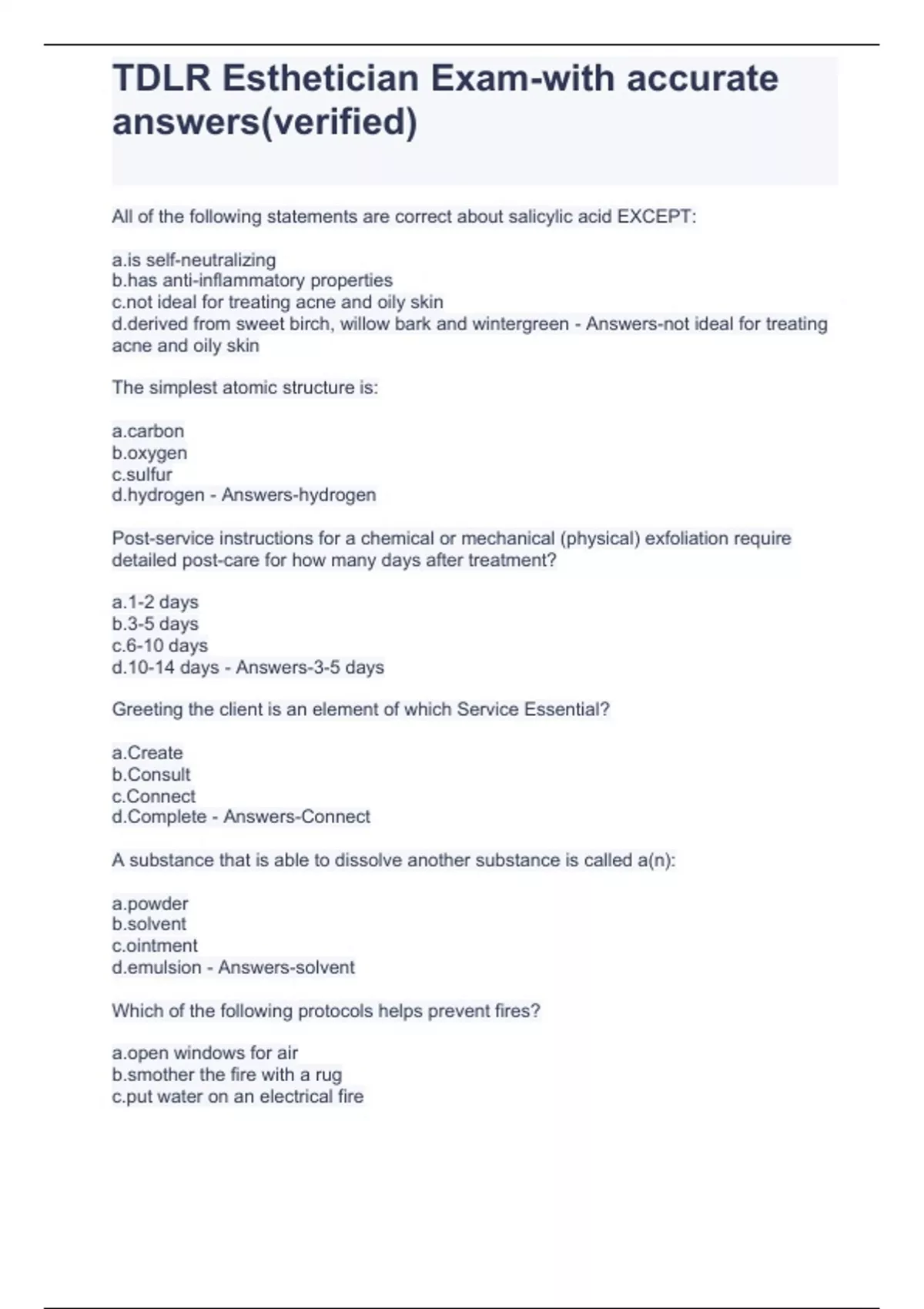 tdlr esthetician exam with accurate answersverifi