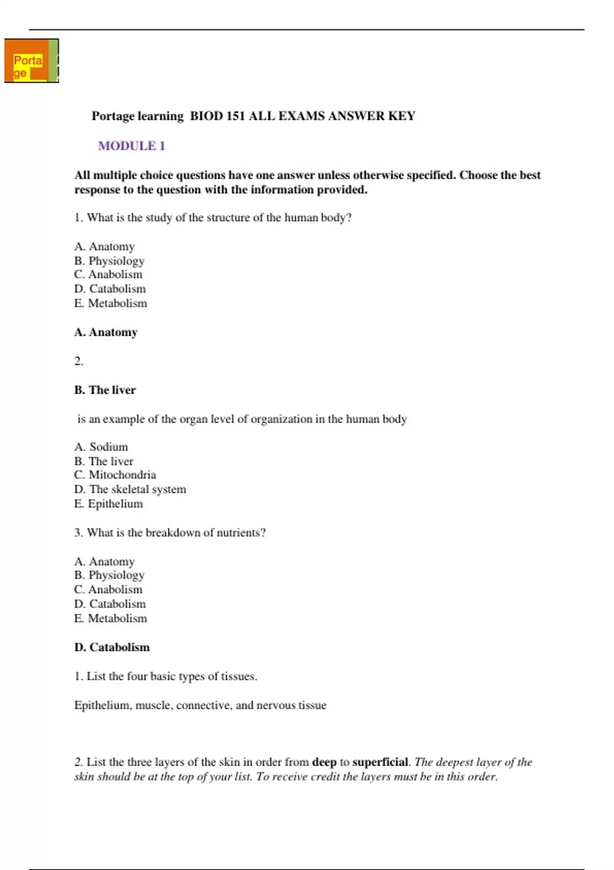 BIOD 151 ALL EXAMS ANSWER KEY 2021/2022-Portage Learning RATED A+