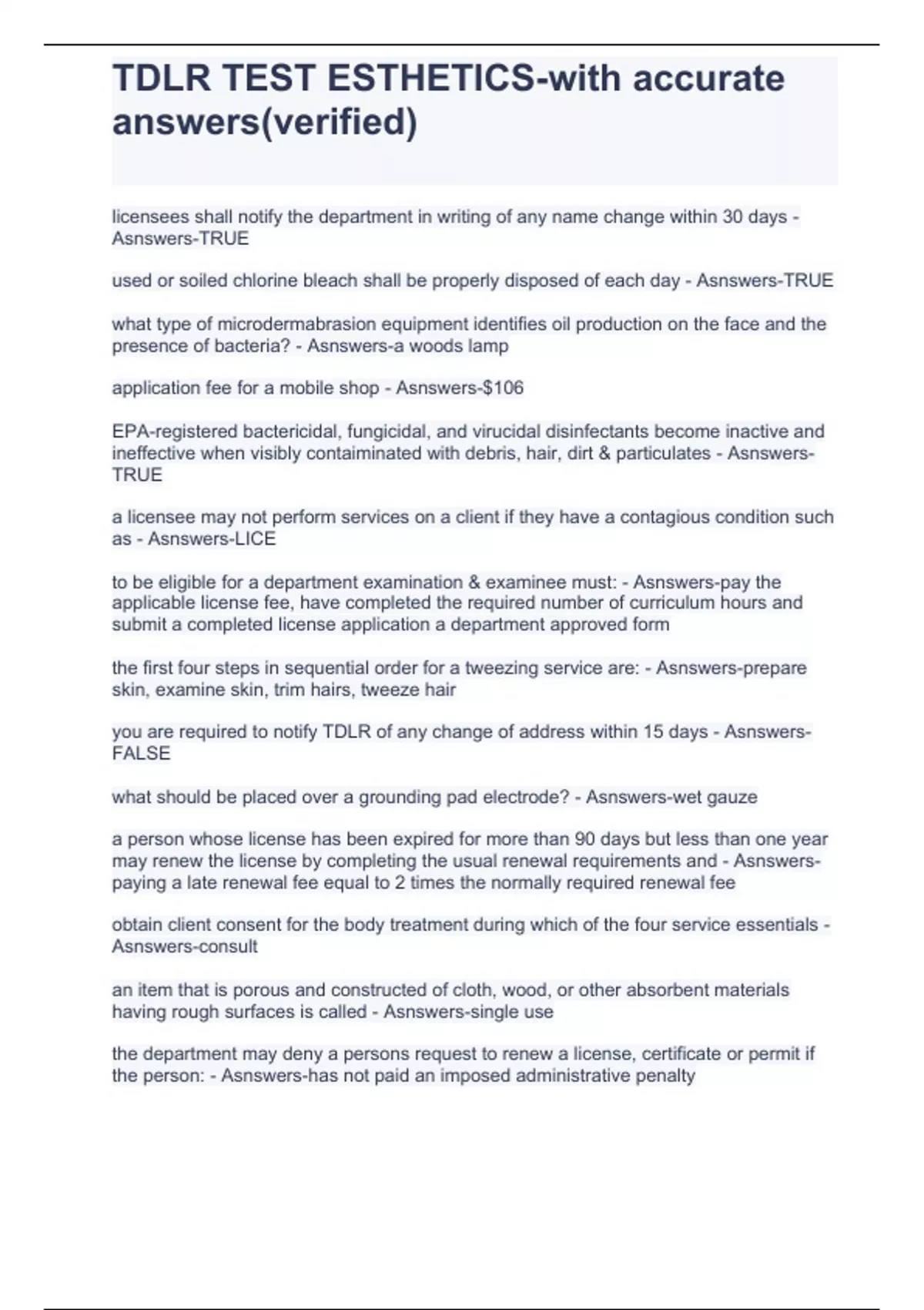 cosmetology establishments shall display in the establishment, in a conspicuous place clearly visible to the public, a copy of the establishments most recent inspection report issued by the dept - Asnswers-TRUE items subject to possible cross contamination such as creams, astringents, lotions, waxes, moisturizers, masks, oils and other preparations shall be used in a manner as to not contaminate the remaining product. applicators shall not - Asnswers-re dipped which of the following guidelines will provide the best results while using a microcurrent device ? - Asnswers-use enough electrode gel beneficial effects from a microdermabrasion treatment include all of the following EXCEPT- - Asnswers-decreased microcirculation (benefits: improved skin texture, removes dead skin cells & reduces epidermal discoloration!) chlorine bleach solution can be mixed and stored up to for a week - Asnswers-FALSE why would an esthetician apply a pre-wax cleanser prior to performing a temporary hair removal treatment - Asnswers-removes dirt and oil