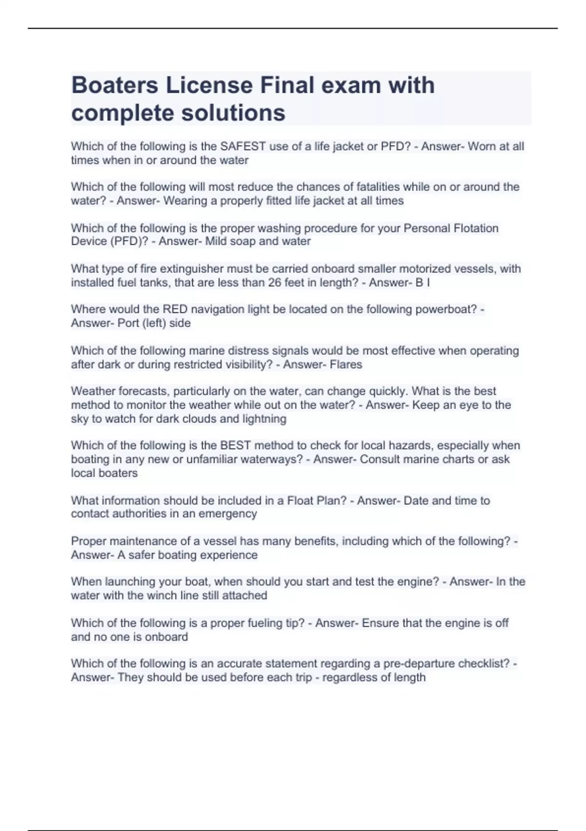 Which of the following is the SAFEST use of a life jacket or PFD? - Answer- Worn at all times when in or around the water Which of the following will most reduce the chances of fatalities while on or around the water? - Answer- Wearing a properly fitted life jacket at all times Which of the following is the proper washing procedure for your Personal Flotation Device (PFD)? - Answer- Mild soap and water What type of fire extinguisher must be carried onboard smaller motorized vessels, with installed fuel tanks, that are less than 26 feet in length? - Answer- B I Where would the RED navigation light be located on the following powerboat? - Answer- Port (left) side Which of the following marine distress signals would be most effective when operating after dark or during restricted visibility? - Answer- Flares Weather forecasts, particularly on the water, can change quickly. What is the best method to monitor the weather while out on the water? - Answer- Keep an eye to the sky to watch for dark clouds and lightning Which of the following is the BEST method to check for local hazards, especially when boating in any new or unfamiliar waterways? - Answer- Consult marine charts or ask local boaters What information should be included in a Float Plan? - Answer- Date and time to contact authorities in an emergency Proper maintenance of a vessel has many benefits, including which of the following? - Answer- A safer boating experience When launching your boat, when should you start and test the engine? - Answer- In the water with the winch line still attached Which of the following is a proper fueling tip? - Answer- Ensure that the engine is off and no one is onboard Which of the following is an accurate statement regarding a pre-departure checklist? - Answer- They should be used before each trip - regardless of length In accordance with Homeland Security measures, recreational boaters should do which of the following? - Answer- Remain at least 100 yards from US Naval vessels Vessel operators should reduce speed when approaching which of the following? - Answer- Swimmers Which of the following is an example of showing courtesy towards other boaters and property owners on the water? - Answer- Discuss safe operation with anyone who operates your boat Who is responsible for ensuring that all passengers are informed about emergency procedures? - Answer- The boat operator Because of the fatiguing effects of the sun, wind and motion of the boat, having one drink on the water is like having how many on shore? - Answer- 3 Which of the following is the best way to help ensure your safety and the safety of others when operating a vessel? - Answer- Avoid alcohol and drugs when operating Drugs and alcohol have which of the foll