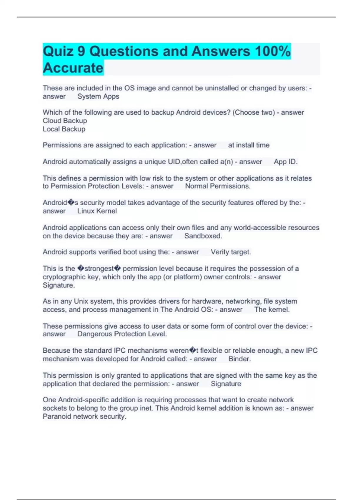 Quiz 9 Questions and Answers 100% Accurate These are included in the OS image and cannot be uninstalled or changed by users: System Apps Which of the following are used to backup Android devices? (Choose two) Cloud Backup Local Backup Permissions are assigned to each application: at install time Android automatically assigns a unique UID,often called a(n) App ID. This defines a permission with low risk to the system or other applications as it relates to Permission Protection Levels: Normal Permissions. Android�s security model takes advantage of the security features offered by the: Linux Kernel Android applications can access only their own files and any world-accessible resources on the device because they are: Sandboxed. Android supports verified boot using the: Verity target. This is the �strongest� permission level because it requires the possession of a cryptographic key, which only the app (or platform) owner controls: Signature. As in any Unix system, this provides drivers for hardware, networking, file system access, and process management in The Android OS: The kernel. These permissions give access to user data or some form of control over the device: Dangerous Protection Level. Because the standard IPC mechanisms weren�t flexible or reliable enough, a new IPC mechanism was developed for Android called: Binder. This permission is only granted to applications that are signed with the same key as the application that declared the permission: Signature One Android-specific addition is requiring processes that want to create network sockets to belong to the group inet. This Android kernel addition is known as: Paranoid network security. Which three options describe the types of package management used by Android? (Choose three.) Code Signing. APK Install Process. Installing a Local Package.