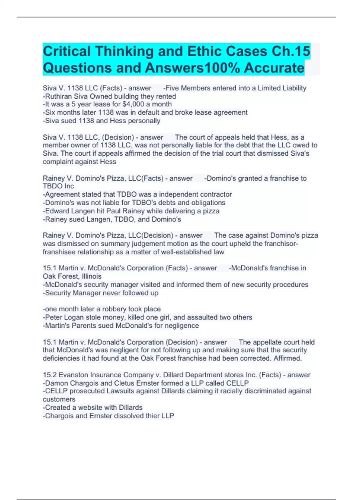 Critical Thinking and Ethic Cases Ch.15 Questions and Answers100% Accurate Siva V. 1138 LLC (Facts) -Five Members entered into a Limited Liability -Ruthiran Siva Owned building they rented -It was a 5 year lease for $4,000 a month -Six months later 1138 was in default and broke lease agreement -Siva sued 1138 and Hess personally Siva V. 1138 LLC, (Decision) The court of appeals held that Hess, as a member owner of 1138 LLC, was not personally liable for the debt that the LLC owed to Siva. The court if appeals affirmed the decision of the trial court that dismissed Siva's complaint against Hess Rainey V. Domino's Pizza, LLC(Facts) -Domino's granted a franchise to TBDO Inc -Agreement stated that TDBO was a independent contractor -Domino's was not liable for TDBO's debts and obligations -Edward Langen hit Paul Rainey while delivering a pizza -Rainey sued Langen, TDBO, and Domino's Rainey V. Domino's Pizza, LLC(Decision) The case against Domino's pizza was dismissed on summary judgement motion as the court upheld the franchisor-franshisee relationship as a matter of well-established law 15.1 Martin v. McDonald's Corporation (Facts) -McDonald's franchise in Oak Forest, Illinois -McDonald's security manager visited and informed them of new security procedures -Security Manager never followed up -one month later a robbery took place -Peter Logan stole money, killed one girl, and assaulted two others -Martin's Parents sued McDonald's for negligence 15.1 Martin v. McDonald's Corporation (Decision) The appellate court held that McDonald's was negligent for not following up and making sure that the security deficiencies it had found at the Oak Forest franchise had been corrected. Affirmed. 15.2 Evanston Insurance Company v. Dillard Department stores Inc. (Facts) -Damon Chargois and Cletus Ernster formed a LLP called CELLP -CELLP prosecuted Lawsuits against Dillards claiming it racially discriminated against customers -Created a website with Dillards -Chargois and Ernster dissolved thier LLP -Dillard sued CELLP for copyright infringement and cyber piracy -The court order CELLP to pay Dillard $143,500 -Since CELLP was no longer active he sued Chargois and Ernster claiming they were personally liable 15.3 Evanston Insurance Company v. Dillard Department stores Inc.(Decision) The defendant's claim of limited liability was found to be invalid by the appellate court due to the individual actions of each defendant 15.4 Fuzzy Toys, LLC v. Catherine (Facts) -Angela, Yoko, Cherise, and Serena for a LLC called Fuzzy Toys -Each member contributes $50,000 as their capital contribution -They purchase $800,000 of liability insurance -Produce a doll -A part of the doll is breaking off and some children are swallowing it -Catherine a 7-year old child swallows the piece and is severely injured 15.4 Fuzzy Toys, LLC v. Catherine (Decision) -The jury awards Catherine $10 million dollars -The members of Fuzzy toys only owe $50,000 each since its is a LLC -She also gets the $800,000 in liability insurance 15.9 iN LLC (Facts) -Christopher, Melony, Xie, and Ruth formed a LLC -Created a device -Cost $29 to make and profit was $25 -Melony sells the plans and drawings for the unit to a competitor for $100 million -The competitor then comes out with the product and beats the LLC to the market -As a result they suffer $100 million in damages 15.9 IN LLC(Decision) Melony is liable because she is a manager and broke the Duty of Care by making a secret profit. 15.10 Wickham v. The Southland Corporation (Facts) -Vallerie Campbell purchased an existing 7-11 and became a Southland franchisee -Obtained a beer and wine license -Jesse Lewis Cope purchased a beer from the seven eleven and then drove a car and got into a accident -The parents sued Southland and not Campbell 15.10 Wickham v. The Southland Corporation (Decision) The Court dismissed the case against southland as the court held that southland was not properly sued in this matter and no agency was established as a matter of law
