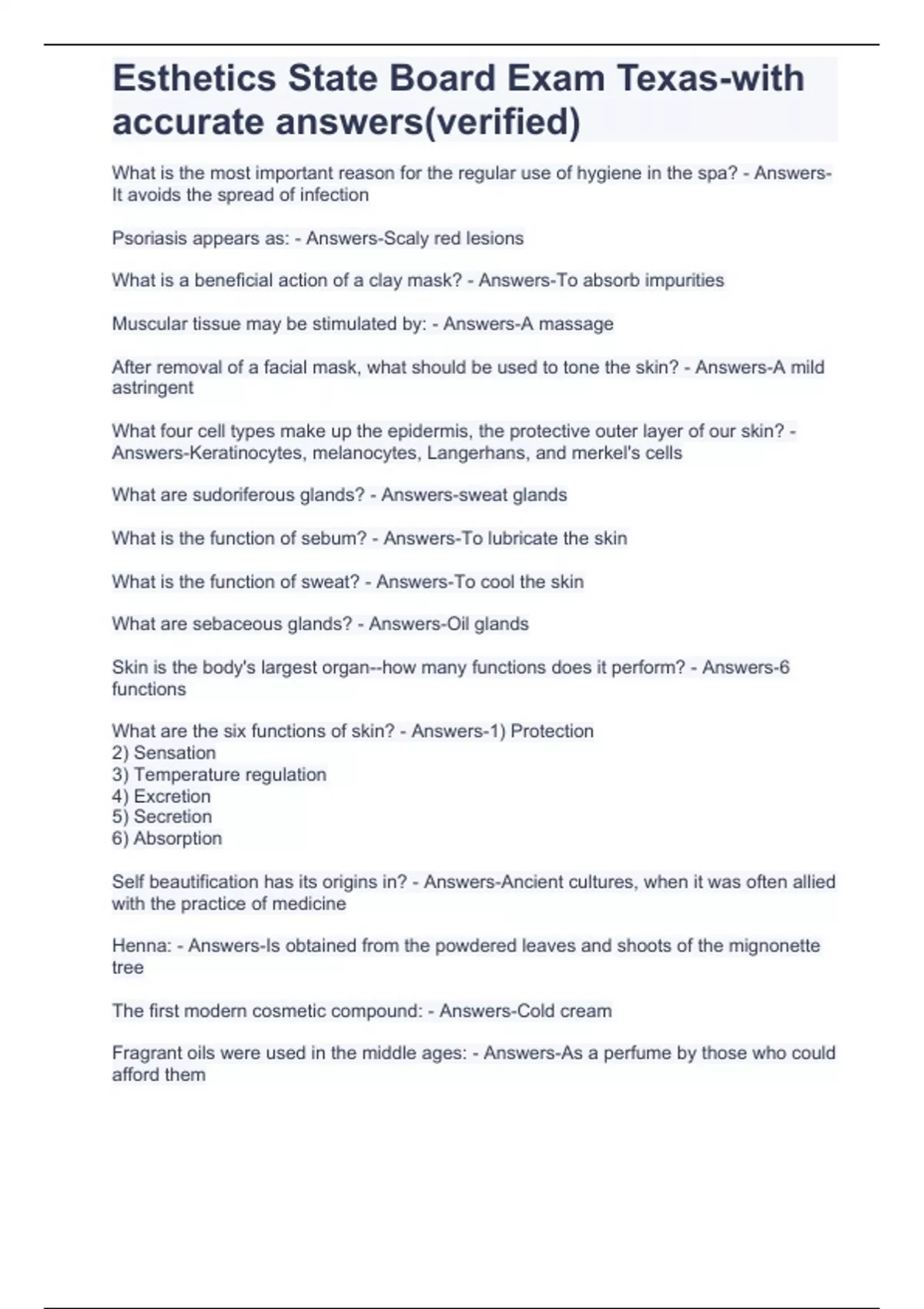 Esthetics State Board Exam Texas-with accurate answers(verified)