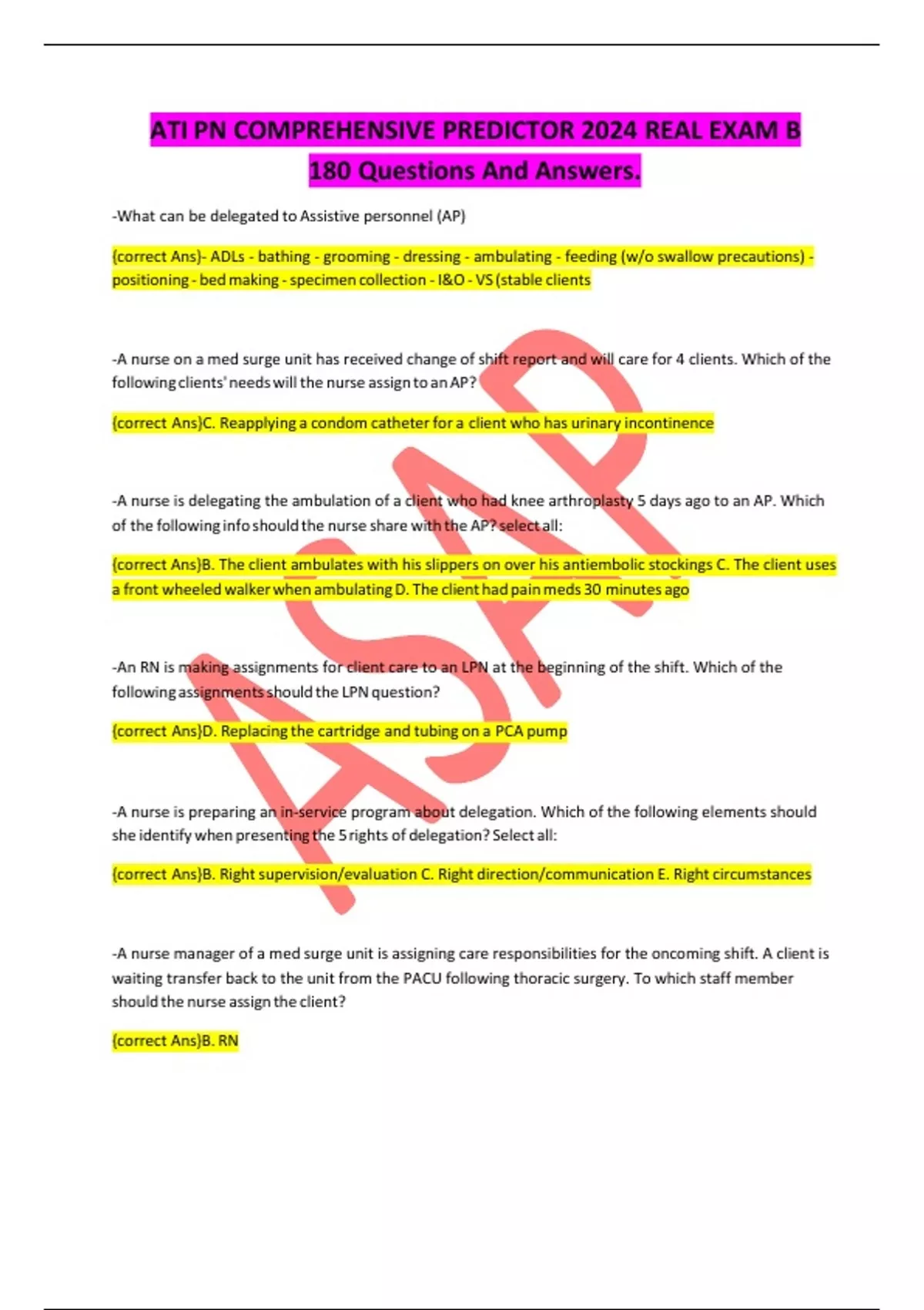 ATI PN COMPREHENSIVE PREDICTOR 2024 REAL EXAM B 180 Questions And Answers. -What can be delegated to Assistive personnel (AP) {correct Ans}- ADLs - bathing - grooming - dressing - ambulating - feeding (w/o swallow precautions) - positioning - bed making - specimen collection - I&O - VS (stable clients -A nurse on a med surge unit has received change of shift report and will care for 4 clients. Which of the following clients' needs will the nurse assign to an AP? {correct Ans}C. Reapplying a condom catheter for a client who has urinary incontinence -A nurse is delegating the ambulation of a client who had knee arthroplasty 5 days ago to an AP. Which of the following info should the nurse share with the AP? select all: {correct Ans}B. The client ambulates with his slippers on over his antiembolic stockings C. The client uses a front wheeled walker when ambulating D. The client had pain meds 30 minutes ago -An RN is making assignments for client care to an LPN at the beginning of the shift. Which of the following assignments should the LPN question? {correct Ans}D. Replacing the cartridge and tubing on a PCA pump -A nurse is preparing an in-service program about delegation. Which of the following elements should she identify when presenting the 5 rights of delegation? Select all: {correct Ans}B. Right supervision/evaluation C. Right direction/communication E. Right circumstances