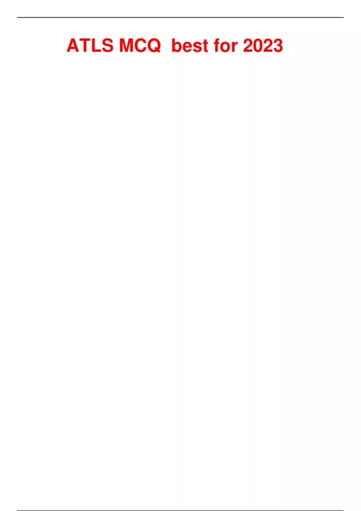 ATLS MCQ best for 2023 ATLS MCQ #1 A 22 year old man is hypotensive and tachycardic after a shotgun wound to the left shoulder. His blood pressure is initially 80/40 mmHg. After 2 liters of crystalloid solution his blood pressure increases to 122/84 mmHg His heart rate is now 100 beats per minute and his respiratory rate is 28 breaths per minute. His breath sounds are decreased in the left hemithorax, and after initial IV fluid resuscitation, a closed tube thoracostomy is performed for decreased left breath sounds with the return of a small amount of blood and no air leak. After chest tube insertion, the most approriate next step is a) reexamine the chest b) perform an aortogram c) obtain a CT scan of the chest d) Obtain arterial blood gas analyses e) perform tranesohageal echocardiography the answer is d ; but a website said a (and a makes more sense to me. so i'll go with a) info: chest tube insertion, p.108 ATLS MCQ #3 During the third trimester of pregnancy, all of the following changesoccur normally EXCEPT a a) decrease in PaCO2 b) decrease in leukocyte count c) reduced gastric emptying rate d) diminished residual lung volume e) diminished elvic ligament tension the answer is b. info: page 261 ATLS MCQ #4 In managing the head injured patient,the most important initial step is to a) secure the airway b. obtain c-spine film c) support circulation c) control scalp hemorrhage e) determine the GCS score the answer is a. info: p.154 ATLS MCQ #5 A previously healthy, 70kg (154 pound) man suffers an estimated acute blood loss of 2 liters. Which one of the following statements applies to this patient? a) his pulse pressure will be widened b) his urinary output will be at the lower limits of normal c) he will have tachycardia, but no change in his systolic blood pressure d) his systolic blood pressure will be decreased with a narrowed pulse ressure (true) e) his systolic blood pressure will be maintained with an elevated diastolicpressure the answer is d. info. page 61 ATLS MCQ #6 The physiologic hypervolemia of pregnancy has clinical significance in the management of the severely injured, gravid woman by a) reducing the need for blood transfusion b) increasing the risk of pulmonary edema c) complicating the management of closed head injury d) reducing the volume of crystalloid required for resuscitation e) increasing the volume of blood loss to produce maternal hypotension the answer is e. info. page 261 ATLS MCQ #7 The best guide for adequate fluid resuscitation of the burn patient is a) adequate urinary output b) reversal of systemic acidosis c) normalization of the heart rate d) a normal central venous pressure e) 4mL/kg/percent body burn/24 hours the answer is a. (not sure..) info: pg. 216-217 background: The adequacy of therapy is confirmed by simple determination of adequate urine output and of the haemoglobin and haematocrit levels. The most important guide is the patient’s clinical response source: ATLS MCQ #8 Establishing a diagnosis of shock must include a) hypoxemia b) acidosis c) hypotension d) increased vascular resistance e) evidence of inadequate organ perfusion the answer is e. the info: p.58 ATLS MCQ #9 A 7 year old boy is brought to the emergency department by his parents several minutes after he fell through a window. He is bleeding profusely from a 6-cm wound of his medial right thigh.Immediate management of the wound should consist of a) application of a tourniquet b) direct pressure on the wound c) packing the wound with gauze d) direct pressure on the femoral artery at the groin e) debridement of devitalized tissue the answer is: b info is: p.79; in obvious external bleeding section on table background - tourniquet can be found on p.194, 195. they imply that you use a tourniquet if you are choosing life over limb, and if direct pressure isn't working. (p.195) ATLS MCQ #10 For the patient with severe traumatic brain injury, profound hypocarbia should be avoided to prevent a) respiratory alkalosis b) metabolic acidosis c) cerebral vasoconstriction with diminished perfusion d) neurogenic pulmonary edema e) shift of the oxyhemoglobin dissociation curve the answer is: c info is: related info on page 136,137 -------- background info Carbon dioxide is perhaps the most potent available modulator of cerebrovascular tone and thus cerebral blood flow (CBF) Code=neu ----------- Hypercarbia and hypoxia are both potent cerebral vasodilators that result in increased cerebral blood flow and volume and, potentially, increased ICP; thus, they must be avoided. Orotracheal intubation allows for airway protection in patients who are severely obtunded and allows for better control of oxygenation and ventilation. ------------ ATLS MCQ #11 A 25 year old man is brought to a hospital with a general surgeon after being involved in a motor vehicle crash. He has a GCS of 13 and complains of abdominal pain. His blood pressure was 80mHg systolic by palpation on arrival at the hospital, but increases to 110/70 mmHg with the administration of 2 liters of intravenous fluid. His heart rate remains 120 beats per minute. Computed tomography shows an aortic injury and splenic laceration with free abdominal fluid. His blood pressure falls to 70mmHg after CT. The next step is a) contrast angiography b) transfer to higher level trauma center c) exploratory laparotomy d) transfuse packed red blood cells e) transesophageal echocardiography the answer is: c info: page 12 - list background info: none for now ATLS MCQ #12 Which one of the following statements regarding abdominal trauma in the pregnant patient is true? a) the fetus is in jeopardy only with major abdominal trauma b) leakage of amniotic fluid is an indication for hospital admission c) indications for peritoneal lavage are different from those in the nonpregnant patient d) penetration of an abdominal hollow viscus is more common in late than in early pregnancy e) the secondary survey follows a different pattern from that of the nonpregnant patient t