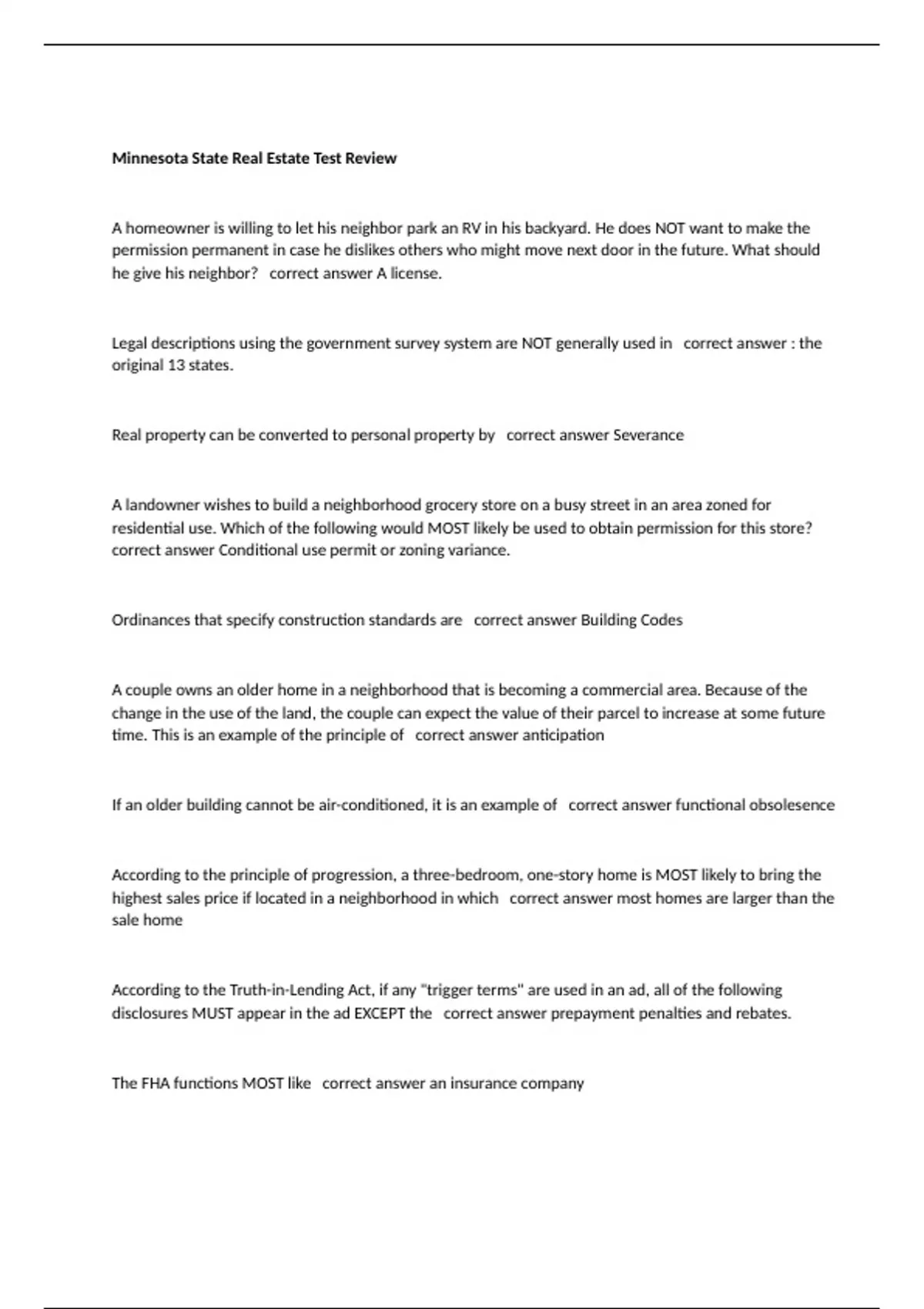 A homeowner is willing to let his neighbor park an RV in his backyard. He does NOT want to make the permission permanent in case he dislikes others who might move next door in the future. What should he give his neighbor? correct answer A license. Legal descriptions using the government survey system are NOT generally used in correct answer : the original 13 states. Real property can be converted to personal property by correct answer Severance A landowner wishes to build a neighborhood grocery store on a busy street in an area zoned for residential use. Which of the following would MOST likely be used to obtain permission for this store? correct answer Conditional use permit or zoning variance. Ordinances that specify construction standards are correct answer Building Codes A couple owns an older home in a neighborhood that is becoming a commercial area. Because of the change in the use of the land, the couple can expect the value of their parcel to increase at some future time. This is an example of the principle of correct answer anticipation If an older building cannot be air-conditioned, it is an example of correct answer functional obsolesence According to the principle of progression, a three-bedroom, one-story home is MOST likely to bring the highest sales price if located in a neighborhood in which correct answer most homes are larger than the sale home According to the Truth-in-Lending Act, if any "trigger terms" are used in an ad, all of the following disclosures MUST appear in the ad EXCEPT the correct answer prepayment penalties and rebates. The FHA functions MOST like correct answer an insurance company