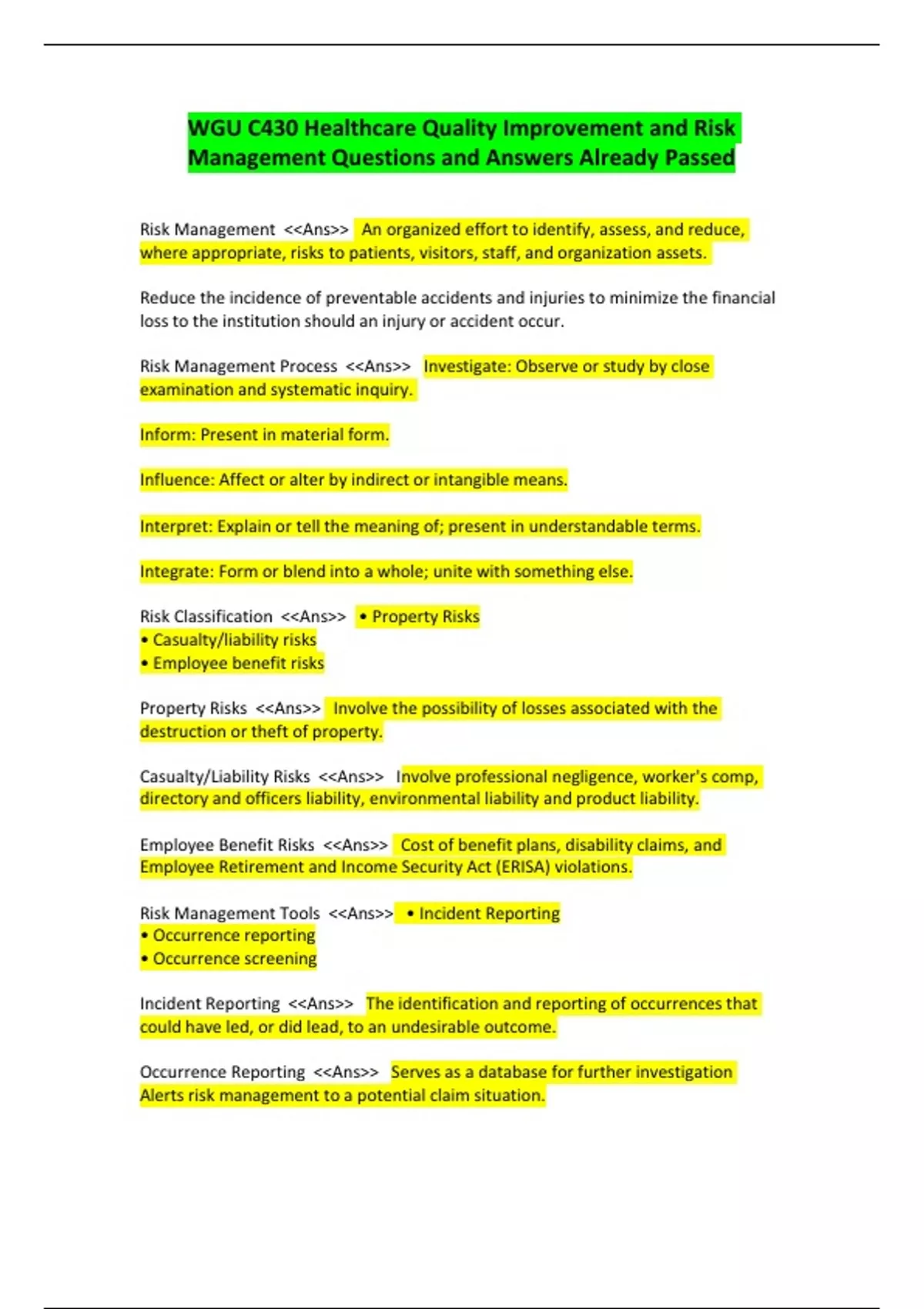 WGU C430 Healthcare Quality Improvement and Risk Management Questions and Answers Already Passed