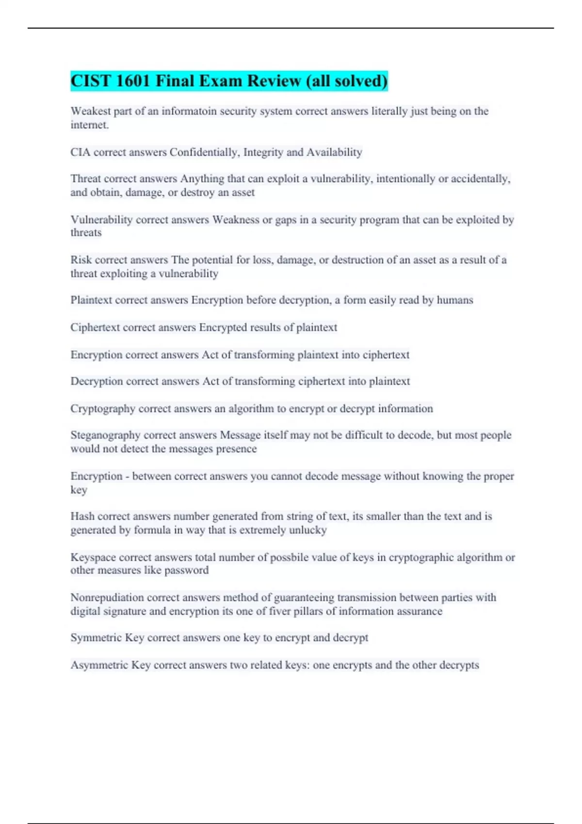 Weakest part of an informatoin security system correct answers literally just being on the internet. CIA correct answers Confidentially, Integrity and Availability Threat correct answers Anything that can exploit a vulnerability, intentionally or accidentally, and obtain, damage, or destroy an asset Vulnerability correct answers Weakness or gaps in a security program that can be exploited by threats Risk correct answers The potential for loss, damage, or destruction of an asset as a result of a threat exploiting a vulnerability Plaintext correct answers Encryption before decryption, a form easily read by humans Ciphertext correct answers Encrypted results of plaintext Encryption correct answers Act of transforming plaintext into ciphertext Decryption correct answers Act of transforming ciphertext into plaintext Cryptography correct answers an algorithm to encrypt or decrypt information Steganography correct answers Message itself may not be difficult to decode, but most people would not detect the messages presence Encryption - between correct answers you cannot decode message without knowing the proper key Hash correct answers number generated from string of text, its smaller than the text and is generated by formula in way that is extremely unlucky Keyspace correct answers total number of possbile value of keys in cryptographic algorithm or other measures like password Nonrepudiation correct answers method of guaranteeing transmission between parties with digital signature and encryption its one of fiver pillars of information assurance Symmetric Key correct answers one key to encrypt and decrypt Asymmetric Key correct answers two related keys: one encrypts and the other decrypts