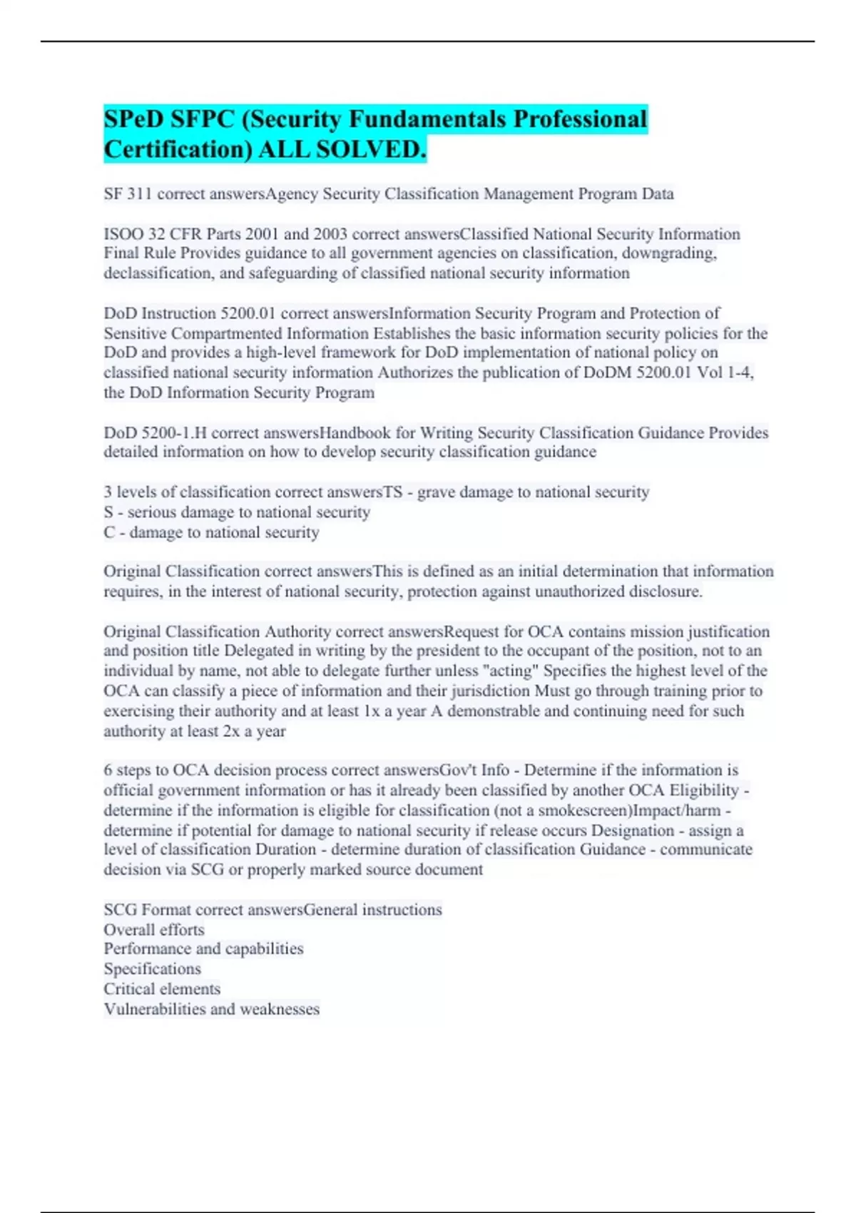 SPeD SFPC (Security Fundamentals Professional Certification) ALL SOLVED.