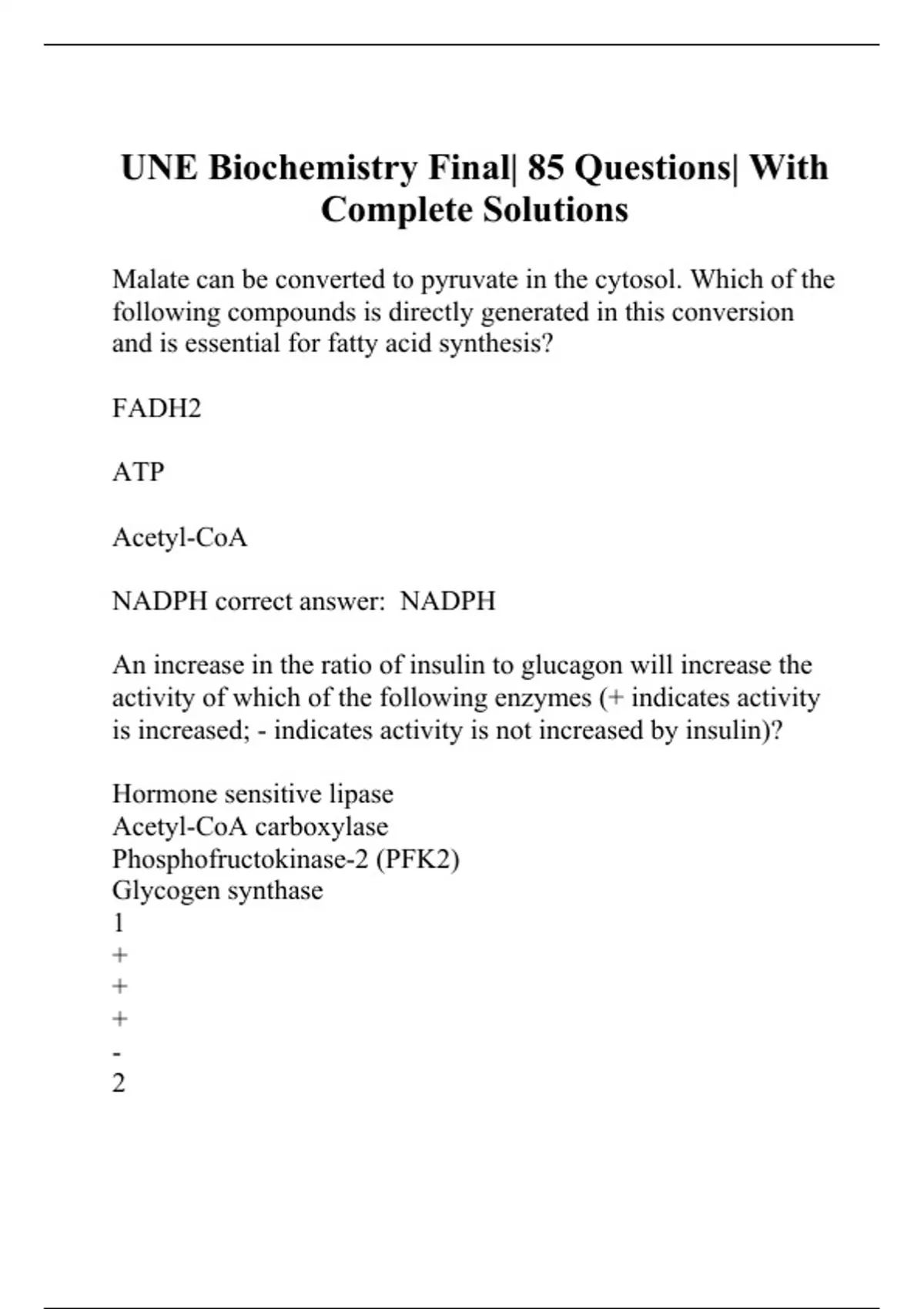 Malate can be converted to pyruvate in the cytosol. Which of the following compounds is directly generated in this conversion and is essential for fatty acid synthesis? FADH2 ATP Acetyl-CoA NADPH correct answer: NADPH An increase in the ratio of insulin to glucagon will increase the activity of which of the following enzymes (+ indicates activity is increased; - indicates activity is not increased by insulin)? Hormone sensitive lipase Acetyl-CoA carboxylase Phosphofructokinase-2 (PFK2) Glycogen synthase 1 + + + - 2 +