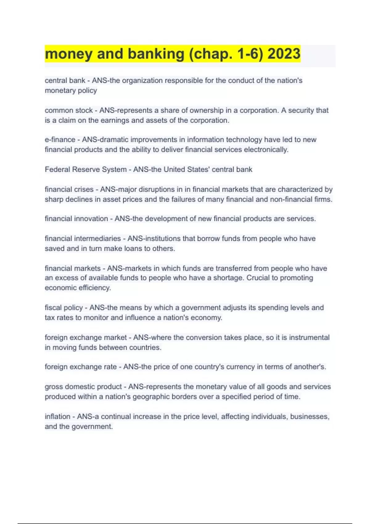 money and banking (chap. 1-6) 2023 central bank - ANS-the organization responsible for the conduct of the nation's monetary policy
