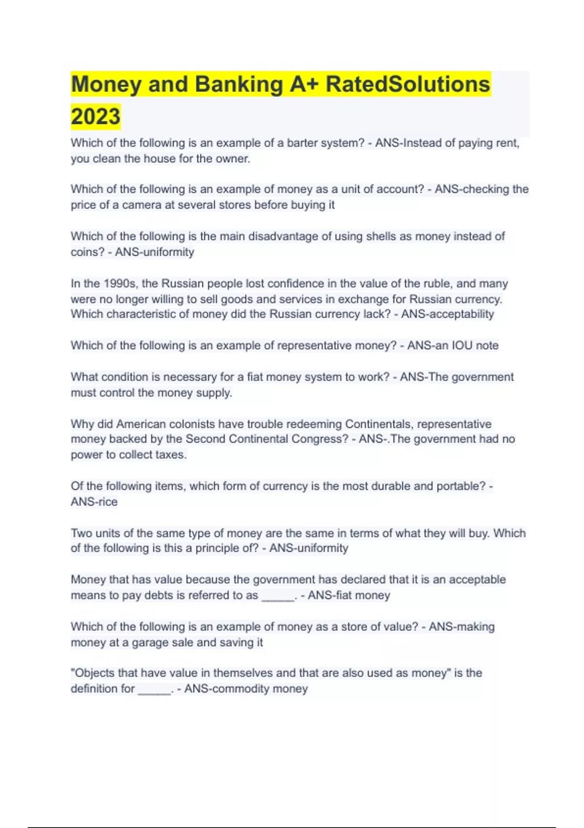 Money and Banking A+ RatedSolutions 2023 Which of the following is an example of a barter system? - ANS-Instead of paying rent, you clean the house for the owner.