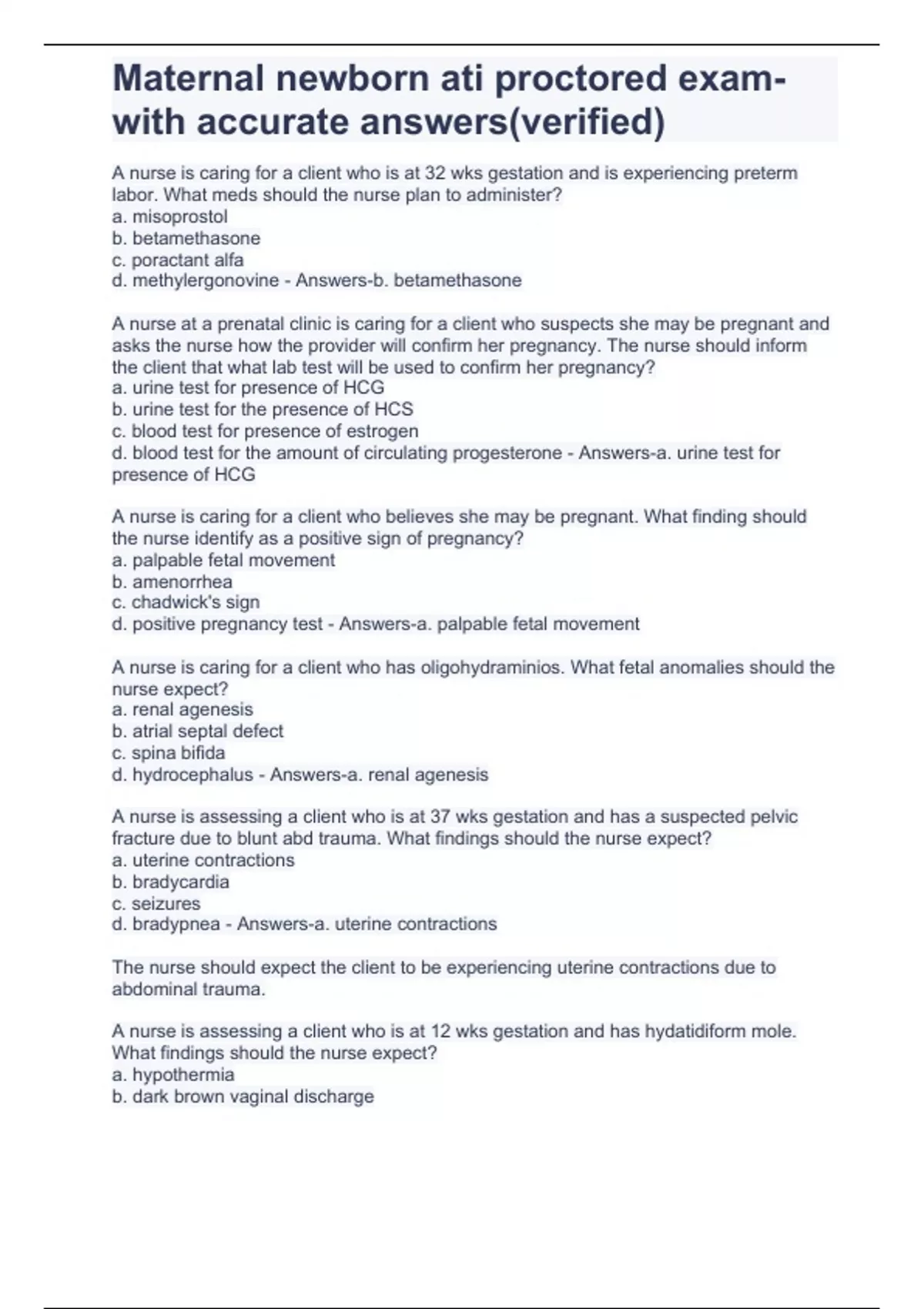 Maternal newborn ati proctore d exam- with accurate answers(verified) graded A