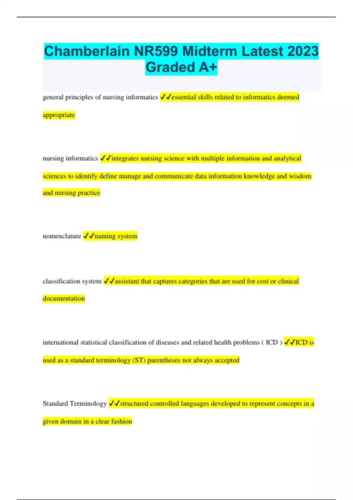 Chamberlain NR599 Midterm Latest 2023 Graded A+ general principles of nursing informatics essential skills related to informatics deemed appropriate nursing informatics integrates nursing science with multiple information and analytical sciences to identify define manage and communicate data information knowledge and wisdom and nursing practice nomenclature naming system classification system assistant that captures categories that are used for cost or clinical documentation international statistical classification of diseases and related health problems ( ICD ) ICD is used as a standard terminology (ST) parentheses not always accepted Standard Terminology structured controlled languages developed to represent concepts in a given domain in a clear fashion Taxonomy uses classification according to a predetermined system to provide a framework for discussion Data Set a named collection of data consisting of individual information organized in a prescribed fashion benefits of using a data set efficiency accuracy and effectiveness resulting in improved patient care and outcomes has an effect on cost information visibility and transformation / health care reform knowledge The awareness and understanding of a set of information and ways that information can be made useful to support a specific task or arrive at a decision wisdom -knowledge applied in a practical way -the highest form of common sense -entails knowing when and how to apply knowledge -It is through efforts to understand the nature of knowledge in its evolution that one can conceive of build and implement informatics tools to enhance and mimic the mind's processes to facilitate decision-making and job performance scientific underpinning The foundation of nursing science through research data evidence and idea creation The foundation of knowledge model A model proposing that humans are organic information systems constantly acquiring, processing, generating, and disseminating information or knowledge in both their professional and personal lives computer science studies the theory underpinning information and computation and their implementation and computer systems cognitive science how the human mind works from an information processing perspective information science The retrieval and management of information as well as human computer interaction two types of informatics competencies 1. generalist- knowledgeable with experience 2. nurse specialist- graduate level education specialized education information literacy The ability to identify when information is needed as well as the skills to find evaluate ineffectively use the same information health literacy The degree to which individuals have the capacity to obtain, process, and understand basic health information and services needed to make appropriate health decisions meaningful use using technology and health information to increase the quality of care delivered patient-centered information systems patient centered information systems focused on collecting data and disseminating information related to direct care four most common types of PCS systems clinical documentation systems pharmacy information systems laboratory information systems radiology information systems clinical decision support systems a computer-based program designed to assist clinicians in making clinical decisions by filtering or integrating vast amounts of information and providing suggestions for clinical intervention electronic medical records / electronic health record a database of an individual's healthcare data during healthcare encounters and/or comprised of any patient data stored in electronic form electronic health record system The database management software enabling the many functions needed to create and maintain an EHR POE/CPOE/CDS POE- practitioner order entry, CPOE- computerized practitioner order entry, CDS- clinical decision support human technology interface The hardware and software through which the user interacts with any technology. for example computers patient monitors and telephones. The human technology interface addresses the user's ability and the technologies functionality to complete the task demand. health information technologies ( h i t ) hardware software integrated technologies are related licenses intellectual property upgrades or packaged solutions sold as services that are designed for or support the use by healthcare entities or patients for the electronic creation maintenance access or exchange of health information alarm fatigue multiple false alarms by smart technology that cause workers to ignore or respond slowly to them digital natives a person born or brought up during the age of digital technology and therefore familiar with computers and the internet from an early age information literacy competency standards for nursing able to recognize when information is needed and having the ability to locate evaluate and use effectively the needed information HITECH Act of 2009 -Provided incentive payments to hospitals and healthcare providers to adopt health IT. tiger based nursing informatics competencies model -technology informatics guiding education reform team -a plan to include informatics courses and all levels of nursing education when the effort is complete they will examine how to get the information out to practicing nurses who are not currently enrolled in an academic program meaningful use the use of certified electronic health record technology to achieve health and efficiency goals, with a financial incentive from Medicare and Medicaid