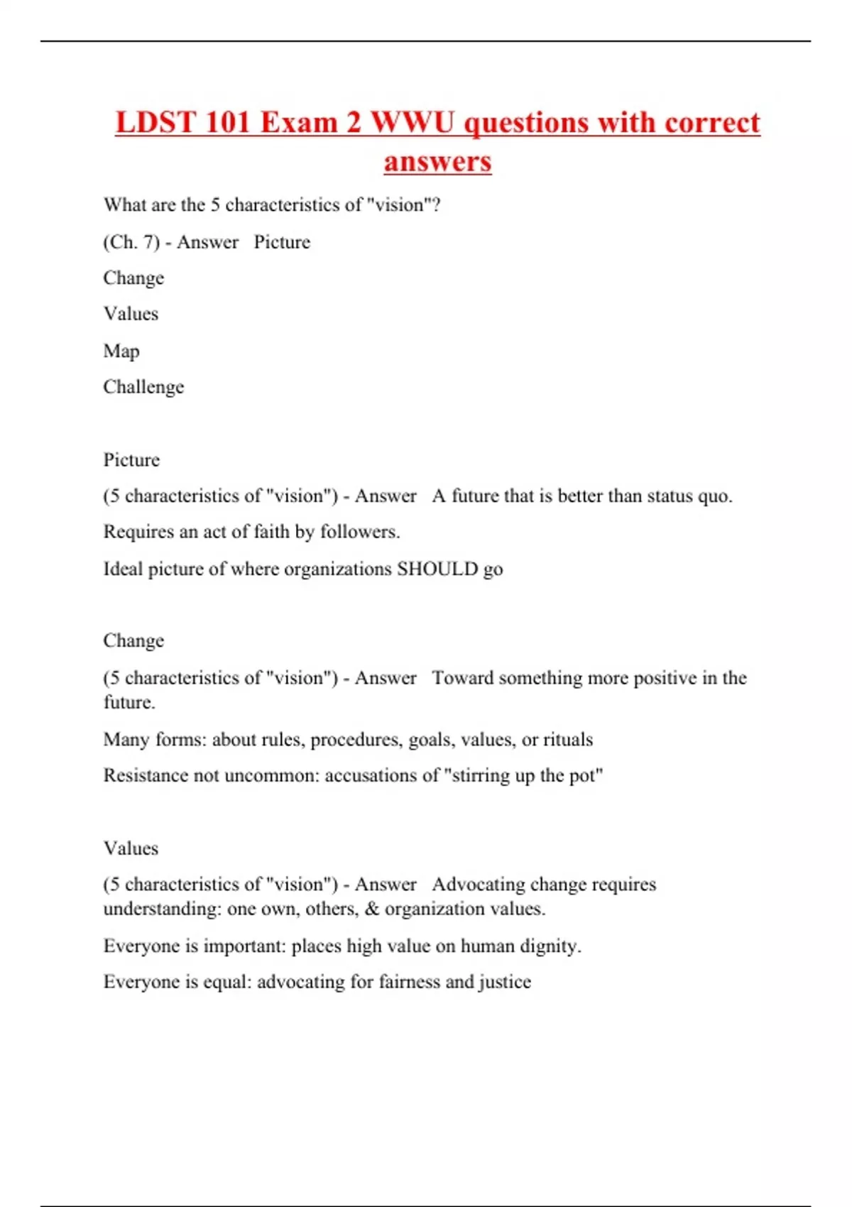 What are the 5 characteristics of "vision"? (Ch. 7) - Answer Picture Change Values Map Challenge Picture (5 characteristics of "vision") - Answer A future that is better than status quo. Requires an act of faith by followers. Ideal picture of where organizations SHOULD go Change (5 characteristics of "vision") - Answer Toward something more positive in the future. Many forms: about rules, procedures, goals, values, or rituals Resistance not uncommon: accusations of "stirring up the pot" Values (5 characteristics of "vision") - Answer Advocating change requires understanding: one own, others, & organization values. Everyone is important: places high value on human dignity. Everyone is equal: advocating for fairness and justice