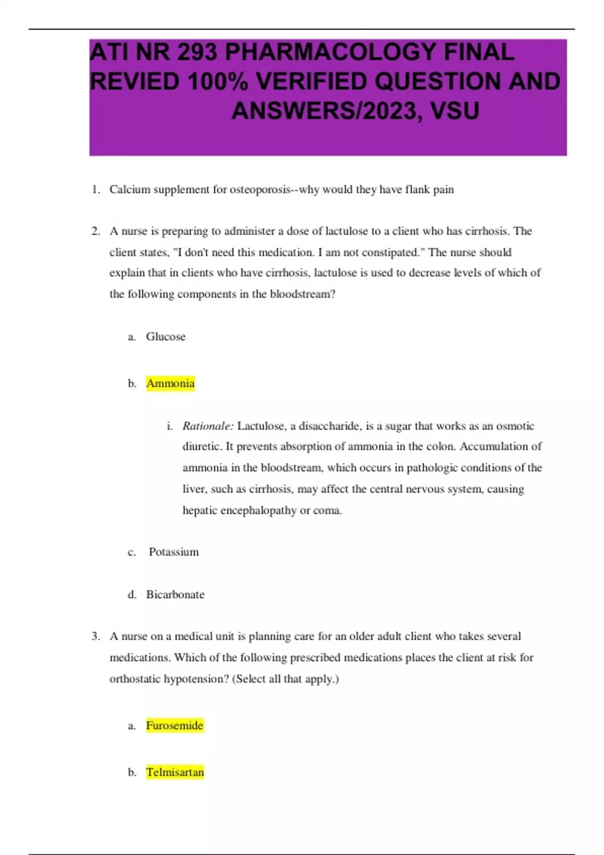 ATI NR 293 PHARMACOLOGY FINAL REVIEW 100% VERIFIED QUESTIONS AND ANSWERS/2023, VSU 1. Calcium supplement for osteoporosis--why would they have flank pain 2. A nurse is preparing to administer a dose of lactulose to a client who has cirrhosis. The client states, "I don't need this medication. I am not constipated." The nurse should explain that in clients who have cirrhosis, lactulose is used to decrease levels of which of the following components in the bloodstream? a. Glucose b. Ammonia i. Rationale: Lactulose, a disaccharide, is a sugar that works as an osmotic diuretic. It prevents the absorption of ammonia in the colon. Accumulation of ammonia in the bloodstream, which occurs in pathologic conditions of the liver, such as cirrhosis, may affect the central nervous system, causing hepatic encephalopathy or coma. c. Potassium d. Bicarbonate 3. A nurse on a medical unit is planning care for an older adult client who takes several medications. Which of the following prescribed medications places the client at risk for orthostatic hypotension? (Select all that apply.) a. Furosemide ATI NR 293 PHARMACOLOGY FINAL REVIEW 100% VERIFIED QUESTIONS AND ANSWERS/2023, VSU b. Telmisartan c. Duloxetine d. Clopidogrel e. Atorvastatin 4. Someone has a-fib on Coumadin and knows what normal PT is 5. Someone is on atorvastatin (statin) what kind of labs do we look at a. Liver function 6. CKD nephrotoxicity a. Antibiotic 7. Heart failure and on Lasix, what are adverse effects of Lasix and w ... Purchase the document to see the full attachment