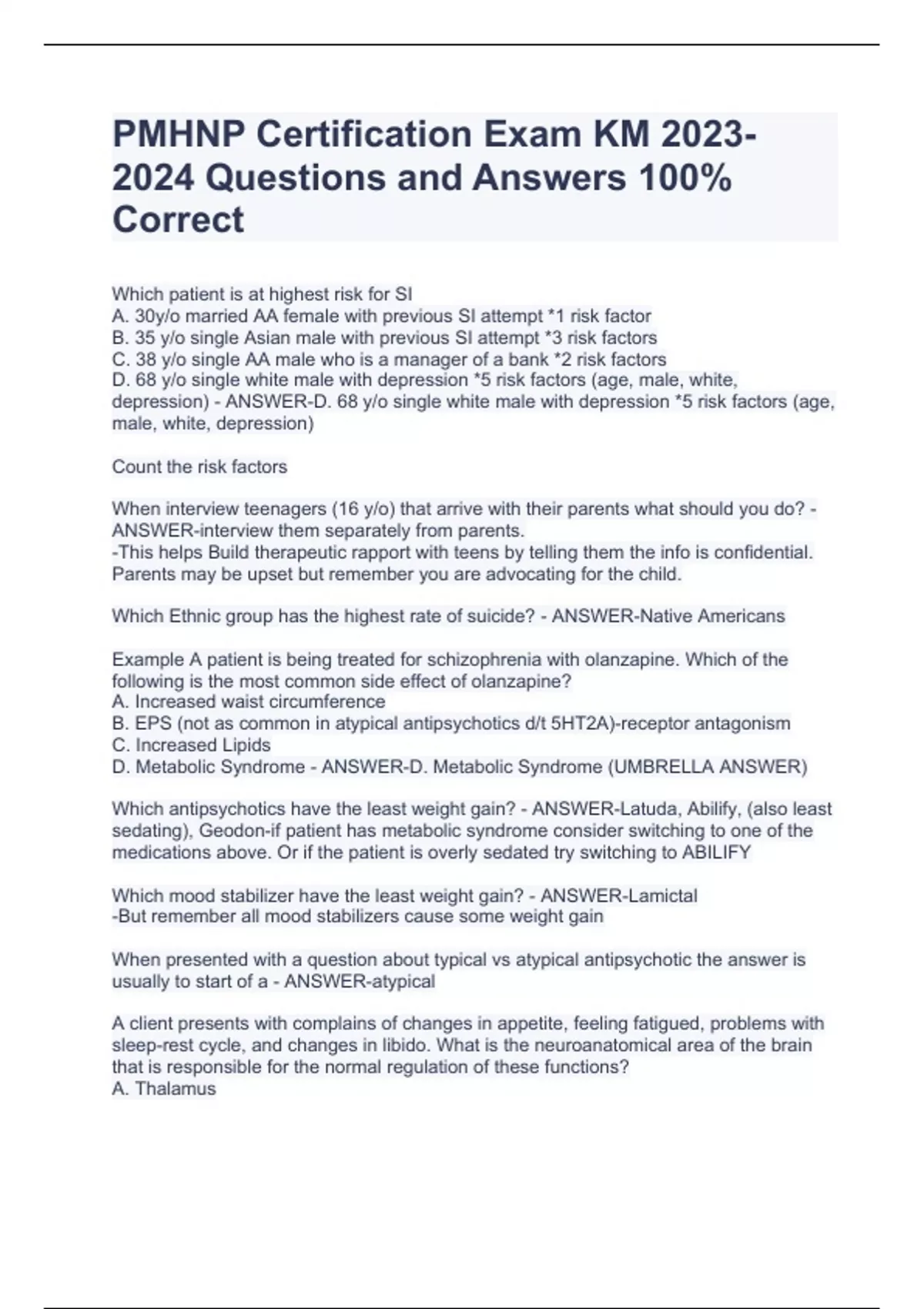 PMHNP Certification Exam KM Questions and Answers 100% CorrectPMHNP Certification Exam KM Questions and Answers 100% CorrectPMHNP Certification Exam KM Questions and Answers 100% CorrectPMHNP Certification Exam KM Questions and Answers 100% CorrectPMHNP Certification Exam KM Questions and Answers 100% Correct Which patient is at highest risk for SI A. 30y/o married AA female with previous SI attempt *1 risk factor B. 35 y/o single Asian male with previous SI attempt *3 risk factors C. 38 y/o single AA male who is a manager of a bank *2 risk factors D. 68 y/o single white male with depression *5 risk factors (age, male, white, depression) - ANSWER-D. 68 y/o single white male with depression *5 risk factors (age, male, white, depression) Count the risk factors When interview teenagers (16 y/o) that arrive with their parents what should you do? - ANSWER-interview them separately from parents. -This helps Build therapeutic rapport with teens by telling them the info is confidential. Parents may be upset but remember you are advocating for the child. Which Ethnic group has the highest rate of suicide? - ANSWER-Native Americans Example A patient is being treated for schizophrenia with olanzapine. Which of the following is the most common side effect of olanzapine? A. Increased waist circumference B. EPS (not as common in atypical antipsychotics d/t 5HT2A)-receptor antagonism C. Increased Lipids D. Metabolic Syndrome - ANSWER-D. Metabolic Syndrome (UMBRELLA ANSWER) Which antipsychotics have the least weight gain? - ANSWER-Latuda, Abilify, (also least sedating), Geodon-if patient has metabolic syndrome consider switching to one of the medications above. Or if the patient is overly sedated try switching to ABILIFY Which mood stabilizer have the least weight gain? - ANSWER-Lamictal -But remember all mood stabilizers cause some weight gain When presented with a question about typical vs atypical antipsychotic the answer is usually to start of a - ANSWER-atypical A client presents with complains of changes in appetite, feeling fatigued, problems with sleep-rest cycle, and changes in libido. What is the neuroanatomical area of the brain that is responsible for the normal regulation of these functions? A. Thalamus