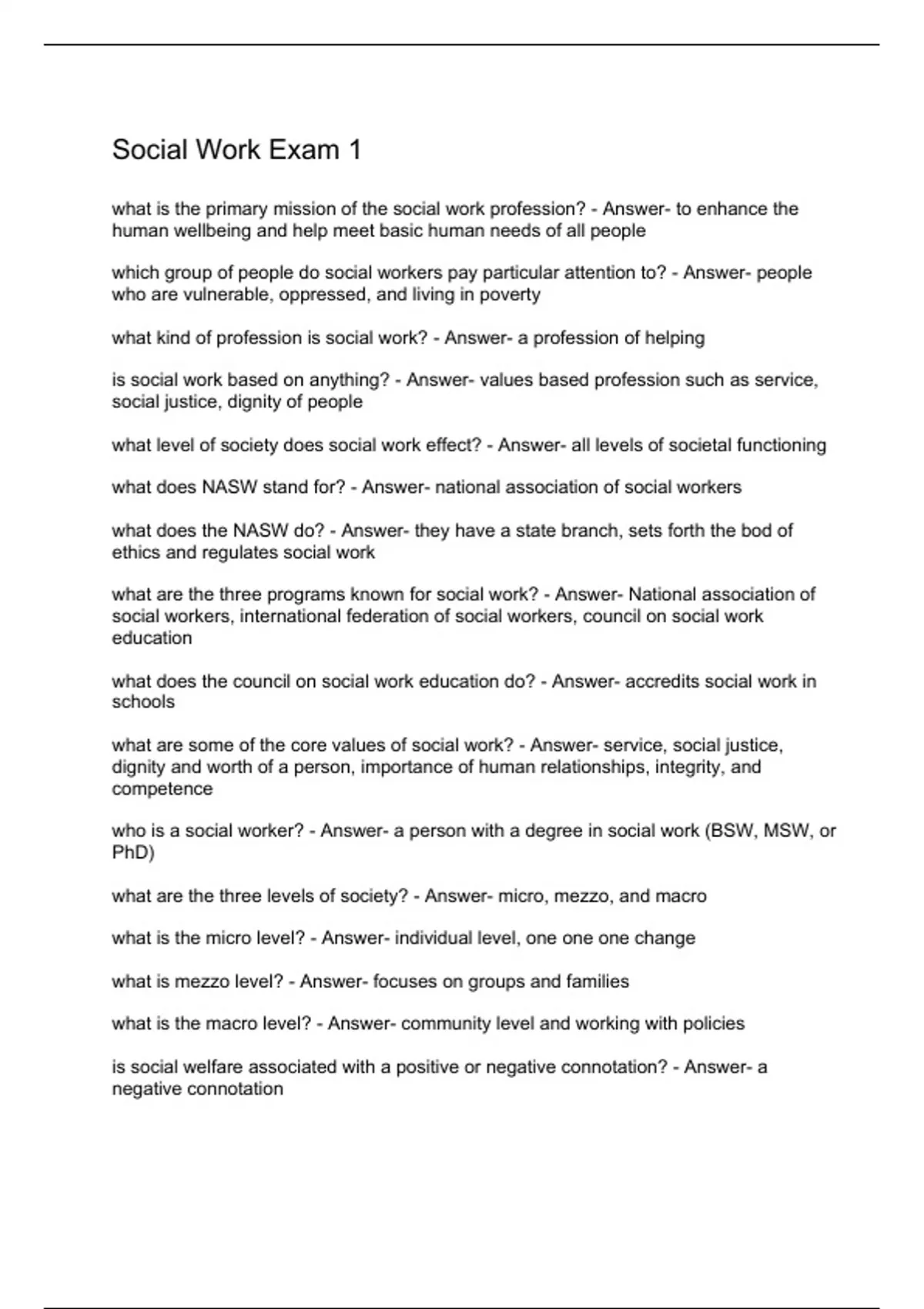what is the primary mission of the social work profession? - Answer- to enhance the human wellbeing and help meet basic human needs of all people which group of people do social workers pay particular attention to? - Answer- people who are vulnerable, oppressed, and living in poverty what kind of profession is social work? - Answer- a profession of helping is social work based on anything? - Answer- values based profession such as service, social justice, dignity of people what level of society does social work effect? - Answer- all levels of societal functioning what does NASW stand for? - Answer- national association of social workers what does the NASW do? - Answer- they have a state branch, sets forth the bod of ethics and regulates social work what are the three programs known for social work? - Answer- National association of social workers, international federation of social workers, council on social work education what does the council on social work education do? - Answer- accredits social work in schools what are some of the core values of social work? - Answer- service, social justice, dignity and worth of a person, importance of human relationships, integrity, and competence who is a social worker? - Answer- a person with a degree in social work (BSW, MSW, or PhD) what are the three levels of society? - Answer- micro, mezzo, and macro what is the micro level? - Answer- individual level, one one one change what is mezzo level? - Answer- focuses on groups and families what is the macro level? - Answer- community level and working with policies is social welfare associated with a positive or negative connotation? - Answer- a negative