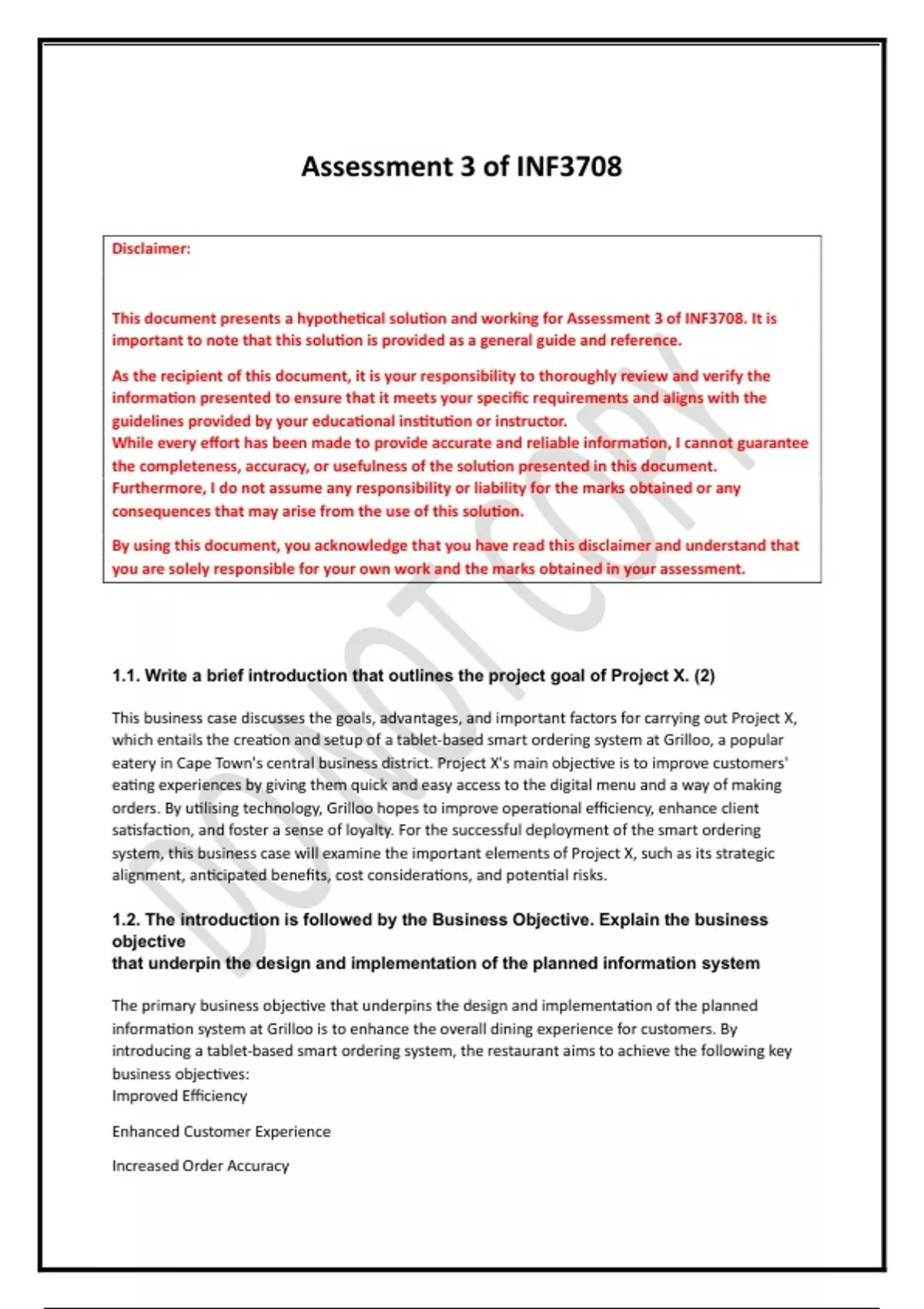 This document presents a hypothetical solution and working for Assessment 3 of INF3708. It is