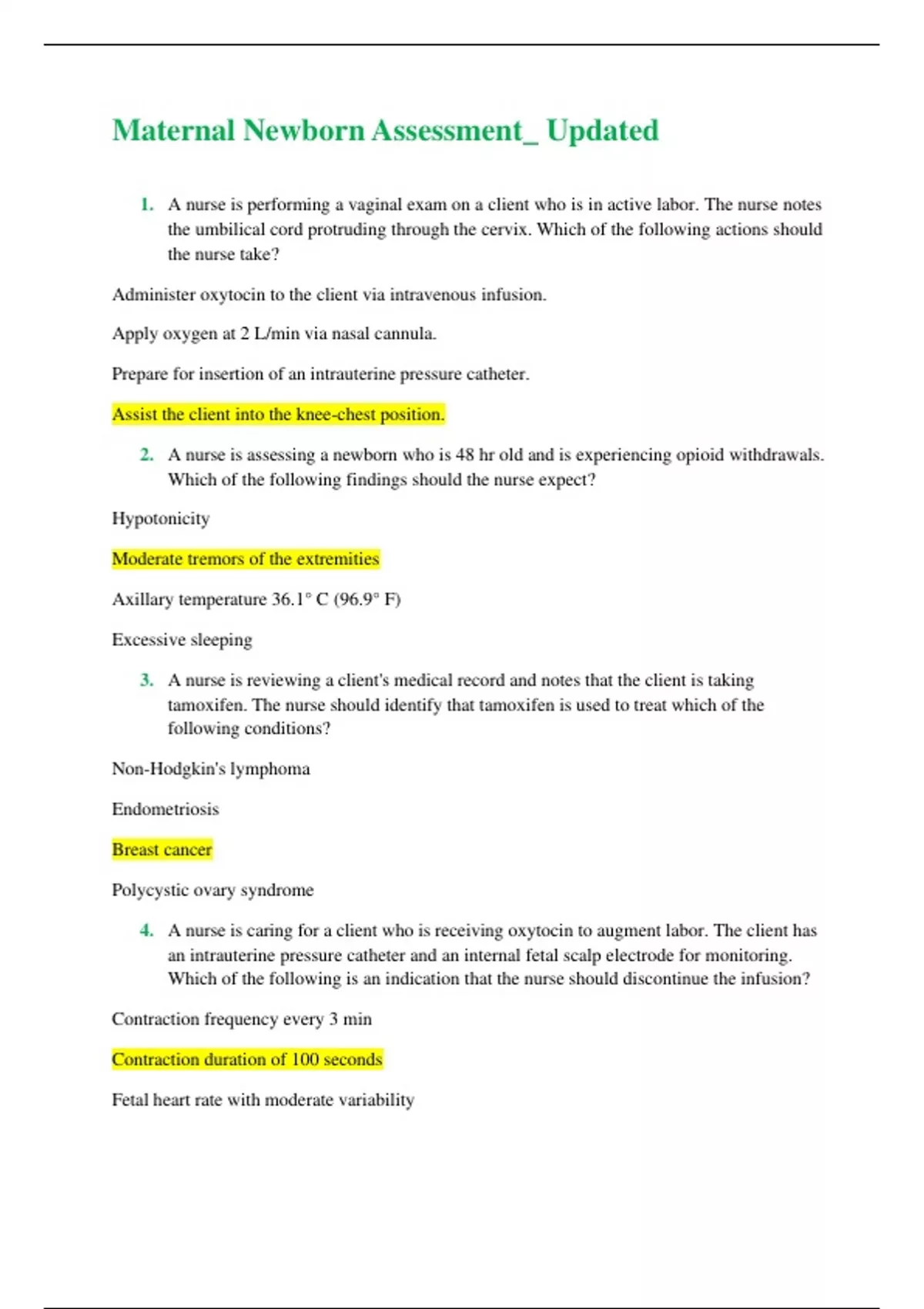 1. A nurse is performing a vaginal exam on a client who is in active labor. The nurse notes the umbilical cord protruding through the cervix. Which of the following actions should the nurse take? Administer oxytocin to the client via intravenous infusion. Apply oxygen at 2 L/min via nasal cannula. Prepare for insertion of an intrauterine pressure catheter. Assist the client into the knee-chest position. 2. A nurse is assessing a newborn who is 48 hr old and is experiencing opioid withdrawals. Which of the following findings should the nurse expect? Hypotonicity Moderate tremors of the extremities Axillary temperature 36.1° C (96.9° F) Excessive sleeping 3. A nurse is reviewing a client's medical record and notes that the client is taking tamoxifen. The nurse should identify that tamoxifen is used to treat which of the following conditions? Non-Hodgkin's lymphoma Endometriosis Breast cancer Polycystic ovary syndrome 4. A nurse is caring for a client who is receiving oxytocin to augment labor. The client has an intrauterine pressure catheter and an internal fetal scalp electrode for monitoring. Which of the following is an indication that the nurse should discontinue the infusion? Contraction frequency every 3 min Contraction duration of 100 seconds Fetal heart rate with moderate variability Fetal heart rate of 118/min 5. A nurse providing dietary teaching for a client who is at 29 weeks of gestation and has phenylketonuria. Which of the following suggested foods should the nurse include in the teaching? A peanut butter sandwich on wheat bread A sliced apple and red grapes A chocolate chip cookie with a glass of skim milk A scrambled egg with cheddar cheese 6. A nurse is reviewing a laboratory report for a client who is at 33 weeks of gestation and has preeclampsia. Which of the following laboratory results should the nurse report to the provider? BUN 35 mg/dL Hgb 15 mg/dL Bilirubin 0.6 mg/dL Hct 37% 7. A nurse is providing teaching about newborn safety to a client who is being admitted for induction of labor. Which of the following client statements indicate an understanding of the teaching? "I will check the identication badge of anyone who removes my baby from our room." "I should include a photo of my baby along with any public birth announcements to social media." "I will allow my baby to sleep on the bed in my room when I am in the shower." "I should expect the nurses to carry my baby in their arms to the nursery." 8. A nurse is assessing a client who is at 31 weeks of gestation. Which of the following findings should the nurse identify as an indication of a potential prenatal complication? Periodic tingling of fingers Absence of clonus Leg cramps Blurred vision 9. A nurse is reviewing the laboratory results of a newborn who is 24 hr old. Which of the following findings should the nurse report to the provider? Hemoglobin 12 g/dL Glucose 50 mg/dL Bilirubin 4 mg/dL Platelets 200,000/mm 10. A nurse is caring for a client who is in labor and has an epidural for pain control. Which of the following clinical manifestations is an adverse effect of epidural anesthesia? Polyuria Hypertension Pruritus Dry mouth 11. A nurse is teaching a client about using an intrauterine device (IUD) for contraception. Which of the following client statements indicate an understanding of the teaching? "I will need to have the IUD replaced each year." "I will need to apply a spermicide prior to intercourse." "I should expect my periods to stop while I have the IUD." "I should check for the string each month after menstruation." 12. A nurse is assessing a newborn who is 10 hr old. Which of the following findings should the nurse report to the provider? Axillary temperature 36.5° C (97.7° F) Nasal faring Heart rate 158/min One void since birth 13. A nurse is assessing a client who gave birth 1 week ago. The client states, "I don't know what's wrong. I love my baby, but I feel so let down and I seem to cry for no reason." The nurse should identify that the client is experiencing which of the following emotional responses to birth? Postpartum depression Taking-in phase Postpartum blues Taking-hold phase 14. A nurse is providing teaching to a group of women about risk factors for ovarian cancer. Which of the following risk factors should the nurse include? (Select all that apply.) Nulliparity History of breastfeeding Previous use of oral contraceptives History of breast cancer Hormone replacement therapy 15. A nurse is caring for a client who is at 38 weeks of gestation and is experiencing continuous abdominal pain and vaginal bleeding. The client has a history of cocaine use. The nurse should identify that the client is likely experiencing which of the following complications? Abruptio placentae Hydatidiform mole Preterm labor Placenta previa ..................................................................................................CONTINUE