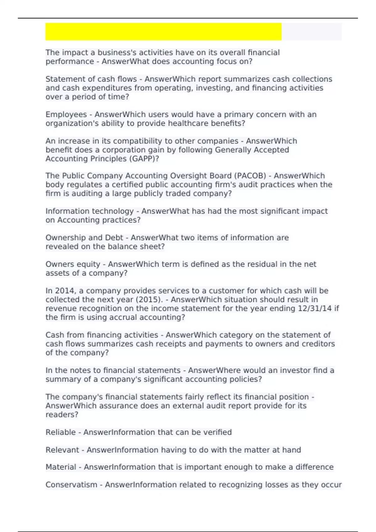 WGU C213 PA & OA Study Guide The impact a business's activities have on its overall financial performance - AnswerWhat does accounting focus on? Statement of cash flows - AnswerWhich report summarizes cash collections and cash expenditures from operating, investing, and financing activities over a period of time? Employees - AnswerWhich users would have a primary concern with an organization's ability to provide healthcare benefits? An increase in its compatibility to other companies - AnswerWhich benefit does a corporation gain by following Generally Accepted Accounting Principles (GAPP)? The Public Company Accounting Oversight Board (PACOB) - AnswerWhich body regulates a certified public accounting firm's audit practices when the firm is auditing a large publicly traded company? Information technology - AnswerWhat has had the most significant impact on Accounting practices? Ownership and Debt - AnswerWhat two items of information are revealed on the balance sheet? Owners equity - AnswerWhich term is defined as the residual in the net assets of a company? In 2014, a company provides services to a customer for which cash will be collected the next year (2015). - AnswerWhich situation should result in revenue recognition on the income statement for the year ending 12/31/14 if the firm is using accrual accounting? Cash from financing activities - AnswerWhich category on the statement of cash flows summarizes cash receipts and payments to owners and creditors of the company? In the notes to financial statements - AnswerWhere would an investor find a summary of a company's significant accounting policies? The company's financial statements fairly reflect its financial position - AnswerWhich assurance does an external audit report provide for its readers? Reliable - AnswerInformation that can be verified Relevant - AnswerInformation having to do with the matter at hand Material - AnswerInformation that