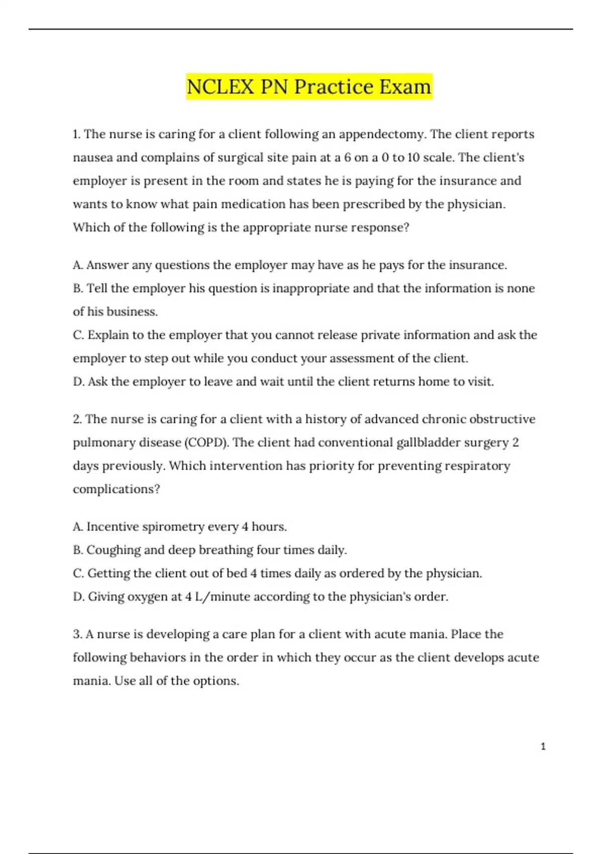 1. The nurse is caring for a client following an appendectomy. The client reports nausea and complains of surgical site pain at a 6 on a 0 to 10 scale. The client's employer is present in the room and states he is paying for the insurance and wants to know what pain medication has been prescribed by the physician. Which of the following is the appropriate nurse response? A. Answer any questions the employer may have as he pays for the insurance. B. Tell the employer his question is inappropriate and that the information is none of his business. C. Explain to the employer that you cannot release private information and ask the employer to step out while you conduct your assessment of the client. D. Ask the employer to leave and wait until the client returns home to visit. 2. The nurse is caring for a client with a history of advanced chronic obstructive pulmonary disease (COPD). The client had conventional gallbladder surgery 2 days previously. Which intervention has priority for preventing respiratory complications? A. Incentive spirometry every 4 hours. B. Coughing and deep breathing four times daily. C. Getting the client out of bed 4 times daily as ordered by the physician. D. Giving oxygen at 4 L/minute according to the physician's order.