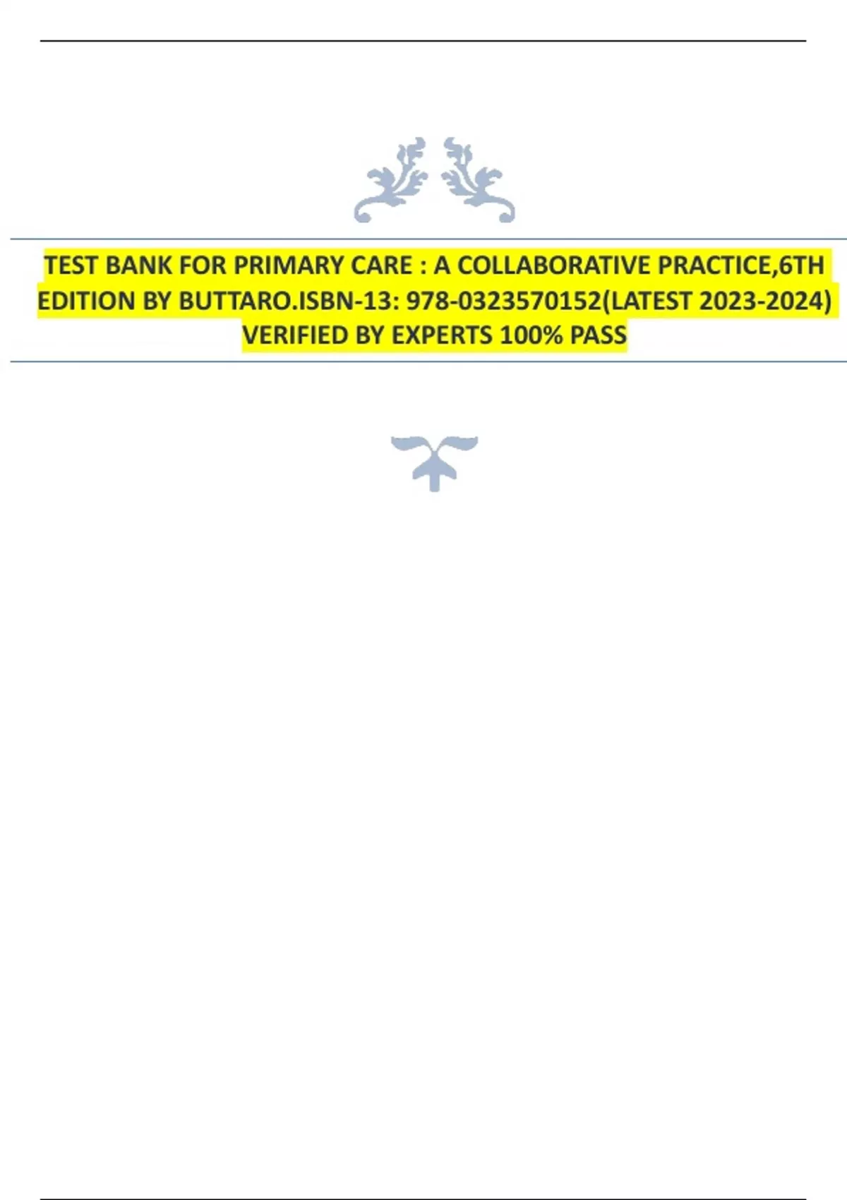TEST BANK FOR PRIMARY CARE : A COLLABORATIVE PRACTICE,6TH EDITION BY BUTTARO.ISBN-13: 978-0323570152(LATEST ) VERIFIED BY EXPERTS 100% PASS