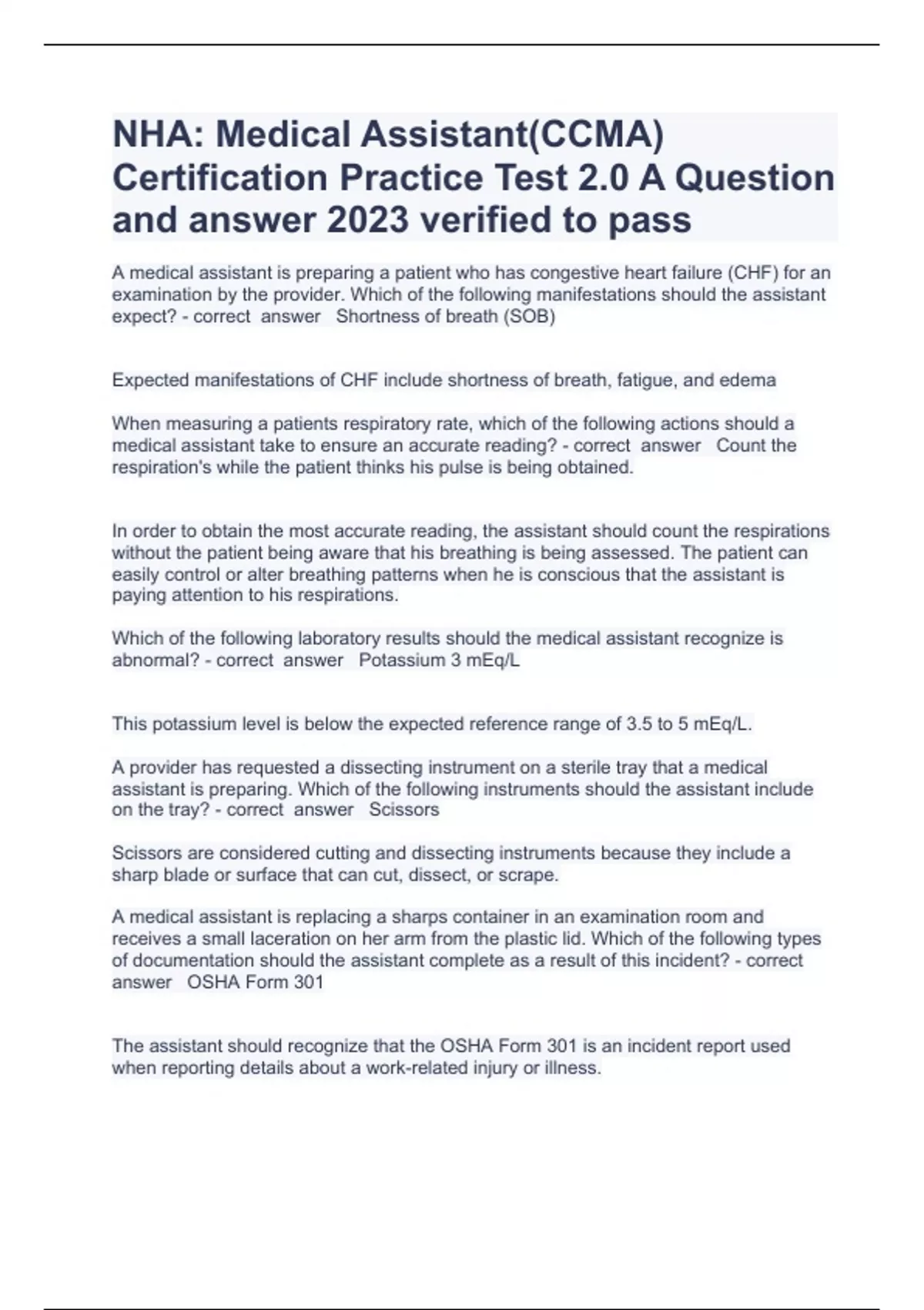 NHA: Medical Assistant(CCMA) Certification Practice Test 2.0 A Question and answer 2023 verified to pass A medical assistant is preparing a patient who has congestive heart failure (CHF) for an examination by the provider. Which of the following manifestations should the assistant expect? - correct answer Shortness of breath (SOB) Expected manifestations of CHF include shortness of breath, fatigue, and edema When measuring a patients respiratory rate, which of the following actions should a medical assistant take to ensure an accurate reading? - correct answer Count the respiration's while the patient thinks his pulse is being obtained. In order to obtain the most accurate reading, the assistant should count the respirations without the patient being aware that his breathing is being assessed. The patient can easily control or alter breathing patterns when he is conscious that the assistant is paying attention to his respirations. Which of the following laboratory results should the medical assistant recognize is abnormal? - correct answer Potassium 3 mEq/L This potassium level is below the expected reference range of 3.5 to 5 mEq/L. A provider has requested a dissecting instrument on a sterile tray that a medical assistant is preparing. Which of the following instruments should the assistant include on the tray? - correct answer Scissors Scissors are considered cutting and dissecting instruments because they include a sharp blade or surface that can cut, dissect, or scrape. A medical assistant is replacing a sharps container in an examination room and receives a small laceration on her arm from