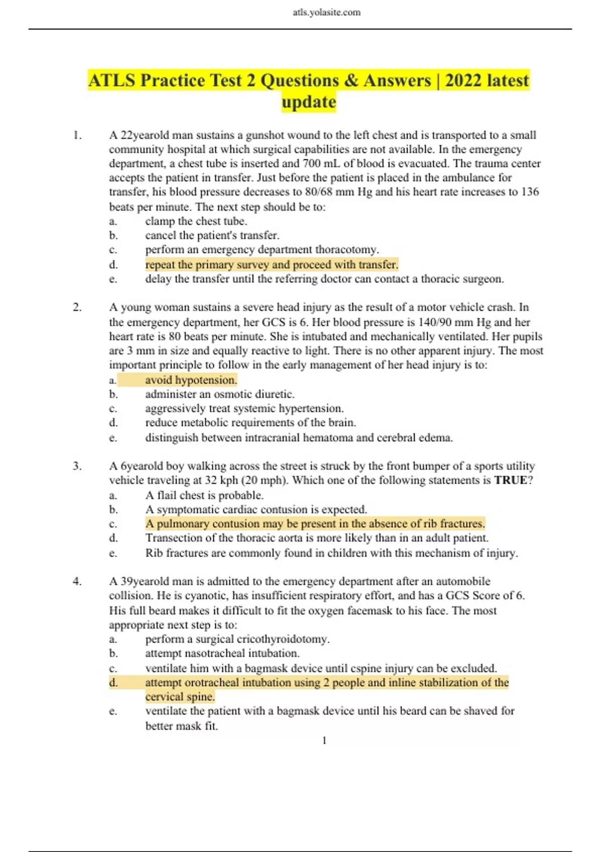 ATLS Practice Test 2 Questions & Answers | 2022 latest update 1. A 22yearold man sustains a gunshot wound to the left chest and is transported to a small community hospital at which surgical capabilities are not available. In the emergency department, a chest tube is inserted and 700 mL of blood is evacuated. The trauma center accepts the patient in transfer. Just before the patient is placed in the ambulance for transfer, his blood pressure decreases to 80/68 mm Hg and his heart rate increases to 136 beats per minute. The next step should be to: a. clamp the chest tube. b. cancel the patient's transfer. c. perform an emergency department thoracotomy. d. repeat the primary survey and proceed with transfer. e. delay the transfer until the referring doctor can contact a thoracic surgeon. 2. A young woman sustains a severe head injury as the result of a motor vehicle crash. In the emergency department, her GCS is 6. Her blood pressure is 140/90 mm Hg and her heart rate is 80 beats per minute. She is intubated and mechanically ventilated. Her pupils are 3 mm in size and equally reactive to light. There is no other apparent injury. The most important principle to follow in the early management of her head injury is to: a. avoid hypotension. b. administer an osmotic diuretic. c. aggressively treat systemic hypertension. d. reduce metabolic requirements of the brain. e. distinguish between intracranial hematoma and cerebral edema. 3. A 6yearold boy walking across the street is struck by the front bumper of a sports utility vehicle traveling at 32 kph (20 mph). Which one of the following statements is TRUE? a. A flail chest is probable. b. A symptomatic cardiac contusion is expected. c. A pulmonary contusion may be present in the absence of rib fractures. d. Transection of the thoracic aorta is more likely than in an adult patient. e. Rib fractures are commonly found in children with this mechanism of injury. 4. A 39yearold man is admitted to the emergency department after an automobile collision. He is cyanotic, has insufficient respiratory effort, and has a GCS Score of 6. His full beard makes it difficult to fit the oxygen facemask to his face. The most appropriate next step is to: a. perform a surgical cricothyroidotomy. b. attempt nasotracheal intubation. c. ventilate him with a bagmask device until cspine injury can be excluded. d. attempt orotracheal intubation using 2 people and inline stabilization of the cervical spine. e. ventilate the patient with a bagmask device until his beard can be shaved for better mask fit.