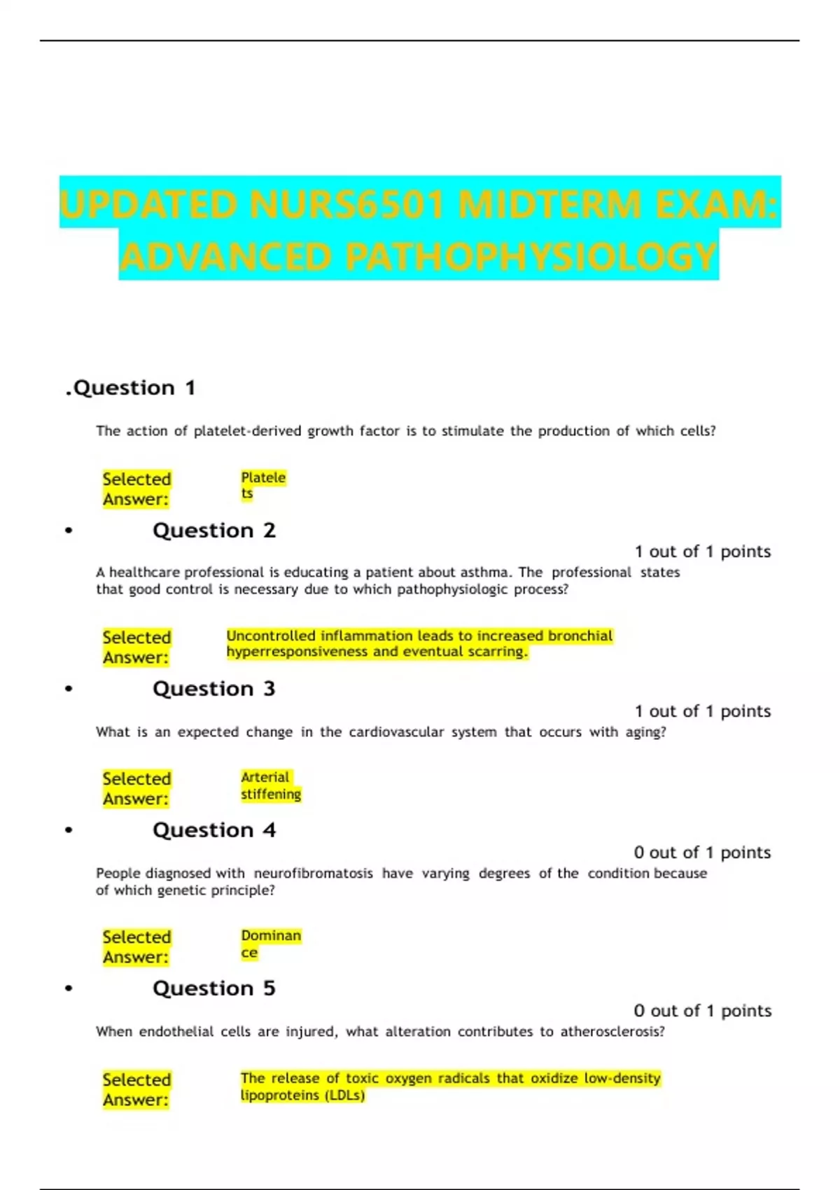 UPDATED NURS6501 MIDTERM EXAM: ADVANCED PATHOPHYSIOLOGY The action of platelet-derived growth factor is to stimulate the production of which cells? Selected Answer: Platele ts • Question 2 1 out of 1 points A healthcare professional is educating a patient about asthma. The professional states that good control is necessary due to which pathophysiologic process? Selected Answer: Uncontrolled inflammation leads to increased bronchial hyperresponsiveness and eventual scarring. • Question 3 1 out of 1 points What is an expected change in the cardiovascular system that occurs with aging? Selected Answer: Arterial stiffening • Question 4 0 out of 1 points People diagnosed with neurofibromatosis have varying degrees of the condition because of which genetic principle? Selected Answer: Dominan ce • Question 5 0 out of 1 points When endothelial cells are injured, what alteration contributes to atherosclerosis? Selected Answer: The release of toxic oxygen radicals that oxidize low-density lipoproteins (LDLs) • Question 6 1 out of 1 points A healthcare professional cares for older adults in a skilled nursing facility. What should the professional assess for in these individuals related to cardiovascular functioning? Selected Answer: Increased rate of falling and dizzy spells • Question 7 0 out of 1 points What physical sign does the healthcare professional relate to the result of turbulent blood flow through a vessel? Selected Answer: Bounding pulse felt on palpation What are tumor cell markers? Selected Answer: Hormones, enzymes, antigens, and antibodies that are produced by cancer cells • Question 9 0 out of 1 points Once they have penetrated the first line of defense, which microorganisms do natural killer (NK) cells actively attack? Selected Answer: Bacteri a • Question 10 1 out of 1 points Which gastric hormone inhibits acid and pepsinogen secretion, as well as decreases the release of gastrin? Selected Answer: Somatosta tin • Question 11 What is the single most common cause of cellular injury