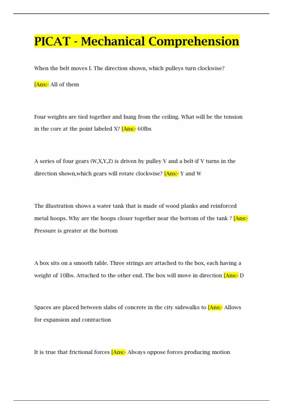 PICAT - Mechanical Comprehension Test Questions and Answers When the belt moves I. The direction shown, which pulleys turn clockwise? [Ans:- All of them Four weights are tied together and hung from the ceiling. What will be the tension in the core at the point labeled X? [Ans:- 60lbs A series of four gears (W,X,Y,Z) is driven by pulley V and a belt-if V turns in the direction shown,which gears will rotate clockwise? [Ans:- Y and W The illustration shows a water tank that is made of wood planks and reinforced metal hoops. Why are the hoops closer together near the bottom of the tank ? [Ans:- Pressure is greater at the bottom