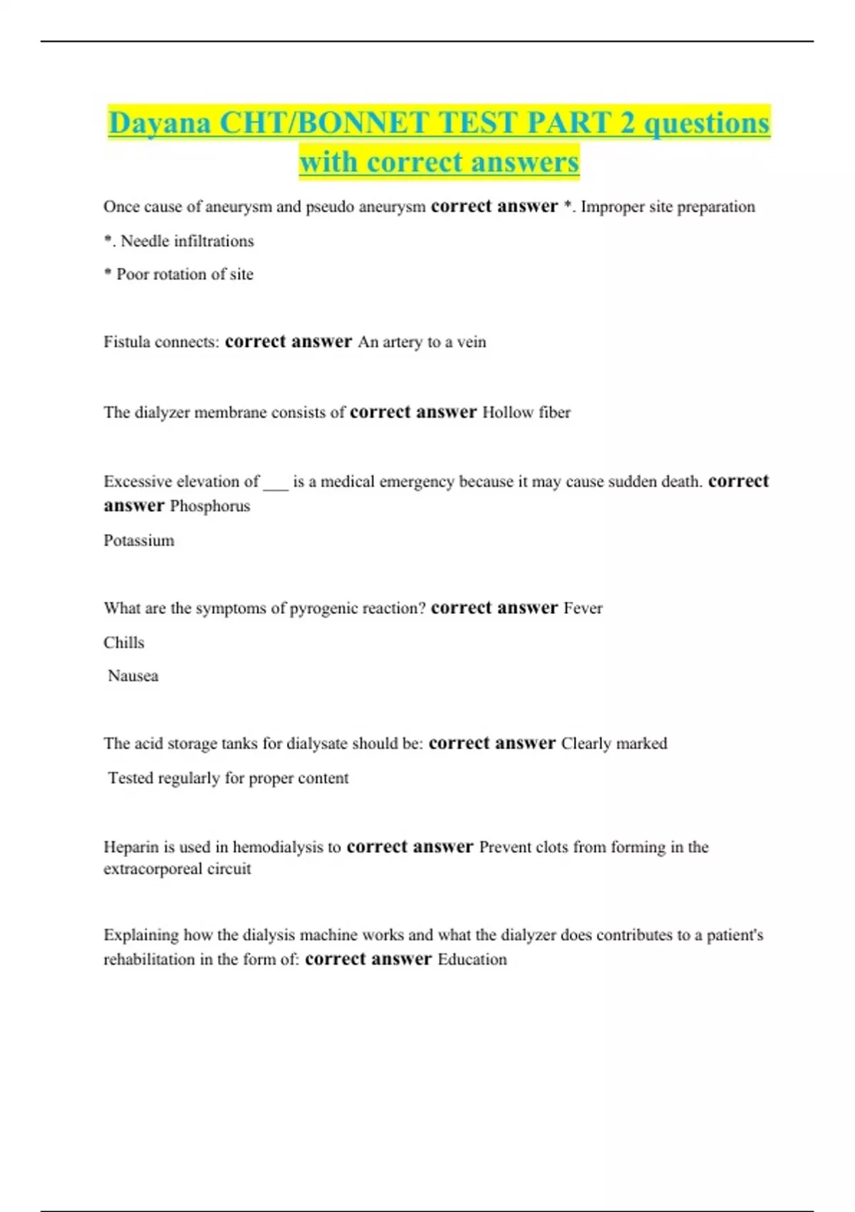 Dayana CHT/BONNET TEST PART 2 questions with correct answers