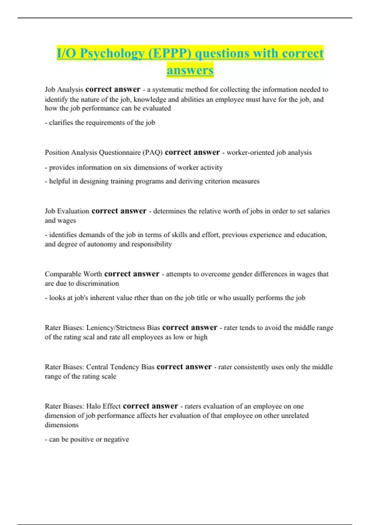 Job Analysis correct answer - a systematic method for collecting the information needed to identify the nature of the job, knowledge and abilities an employee must have for the job, and how the job performance can be evaluated - clarifies the requirements of the job Position Analysis Questionnaire (PAQ) correct answer - worker-oriented job analysis - provides information on six dimensions of worker activity - helpful in designing training programs and deriving criterion measures Job Evaluation correct answer - determines the relative worth of jobs in order to set salaries and wages - identifies demands of the job in terms of skills and effort, previous experience and education, and degree of autonomy and responsibility Comparable Worth correct answer - attempts to overcome gender differences in wages that are due to discrimination - looks at job's inherent value rther than on the job title or who usually performs the job Rater Biases: Leniency/Strictness Bias correct answer - rater tends to avoid the middle range of the rating scal and rate all employees as low or high Rater Biases: Central Tendency Bias correct answer - rater consistently uses only the middle range of the rating scale Rater Biases: Halo Effect correct answer - raters evaluation of an employee on one dimension of job performance affects her evaluation of that employee on other unrelated dimensions