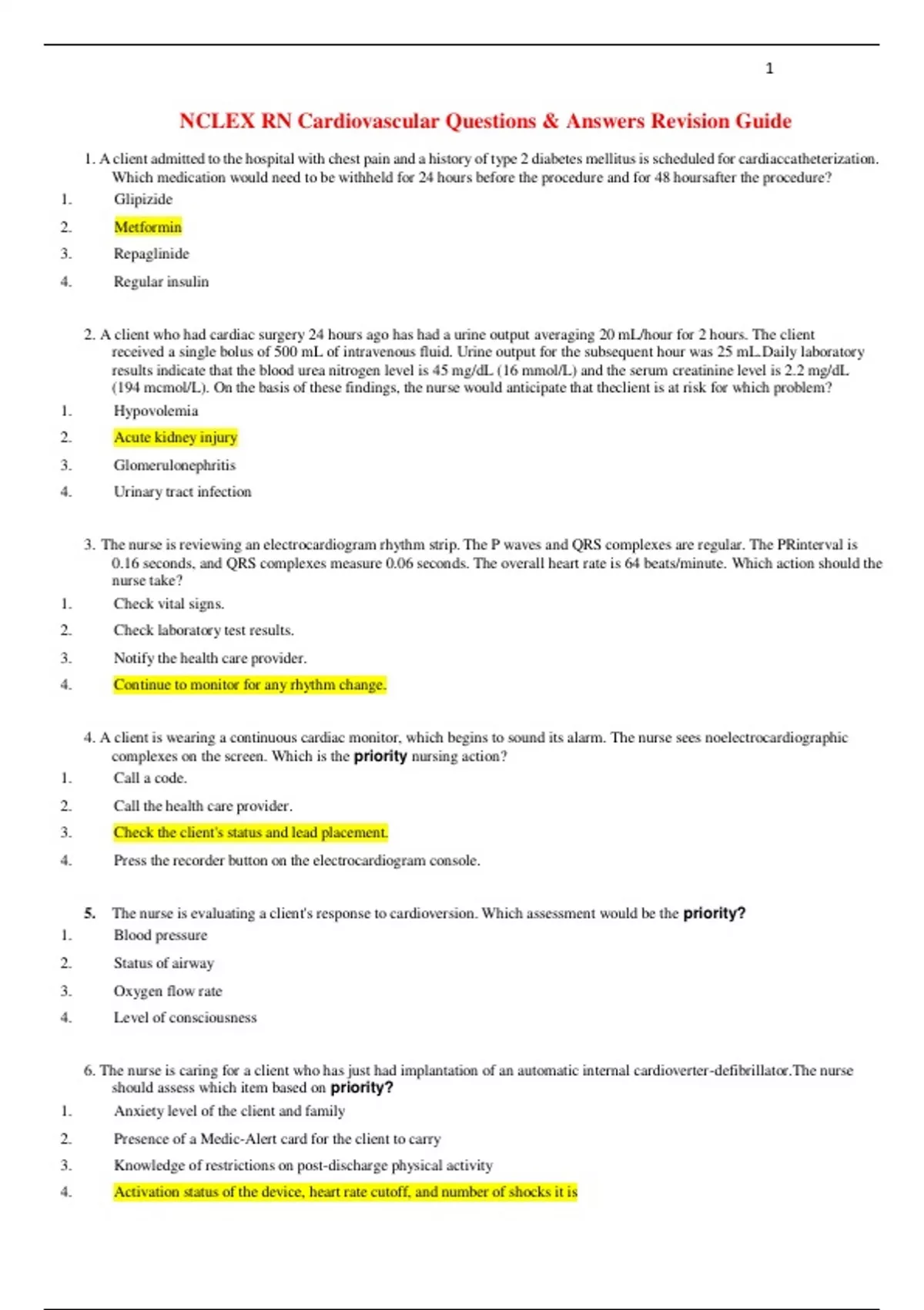 1. A client admitted to the hospital with chest pain and a history of type 2 diabetes mellitus is scheduled for cardiac catheterization. Which medication would need to be withheld for 24 hours before the procedure and for 48 hours after the procedure? 1. Glipizide 2. Metformin 3. Repaglinide 4. Regular insulin 2. A client who had cardiac surgery 24 hours ago has had a urine output averaging 20 mL/hour for 2 hours. The client received a single bolus of 500 mL of intravenous fluid. Urine output for the subsequent hour was 25 mL. Daily laboratory results indicate that the blood urea nitrogen level is 45 mg/dL (16 mmol/L) and the serum creatinine level is 2.2 mg/dL (194 mcmol/L). On the basis of these findings, the nurse would anticipate that the client is at risk for which problem? 1. Hypovolemia 2. Acute kidney injury 3. Glomerulonephritis 4. Urinary tract infection 3. The nurse is reviewing an electrocardiogram rhythm strip. The P waves and QRS complexes are regular. The PR interval is 0.16 seconds, and QRS complexes measure 0.06 seconds. The overall heart rate is 64 beats/minute. Which action should the nurse take? 1. Check vital signs. 2. Check laboratory test results. 3. Notify the health care provider. 4. Continue to monitor for any rhythm change. 4. A client is wearing a continuous cardiac monitor, which begins to sound its alarm. The nurse sees no electrocardiographic complexes on the screen. Which is the priority nursing action? 1. Call a code. 2. Call the health care provider. 3. Check the client's status and lead placement. 4. Press the recorder button on the electrocardiogram console. 5. The nurse is evaluating a client's response to cardioversion. Which assessment would be the priority? 1. Blood pressure 2. Status of airway 3. Oxygen flow rate 4. Level of consciousness 6. The nurse is caring for a client who has just had implantation of an automatic internal cardioverter-defibrillator. The nurse should assess which item based on priority? 1. Anxiety level of the client and family 2. Presence of a Medic-Alert card for the client to carry 3. Knowledge of restrictions on post-discharge physical activity 4. Activation status of the device, heart rate cutoff, and number of shocks it is programmed to deliver 7. A client's electrocardiogram strip shows atrial and ventricular rates of 110 beats/minute. The PR interval is 0.14 seconds, the QRS complex measures 0.08 seconds, and the PP and RR intervals are regular. How should the nurse correctly interpret this rhythm? 1. Sinus tachycardia 2. Sinus bradycardia 3. Sinus dysrhythmia 4. Normal sinus rhythm 8. The nurse is assessing the neurovascular status of a client who returned to the surgical nursing unit 4 hours ago after undergoing aortoiliac bypass graft. The affected leg is warm, and the nurse notes redness and edema. The pedal pulse is palpable and unchanged from admission. How should the nurse correctly interpret the client's neurovascular status? 1. The neurovascular status is normal because of increased blood flow through the leg. 2. The neurovascular status is moderately impaired, and the surgeon should be called. 3. The neurovascular status is slightly deteriorating and should be monitored for another hour. 4. The neurovascular status is adequate from an arterial approach, but venous complications are arising. 9. The nurse is evaluating the condition of a client after pericardiocentesis performed to treat cardiac tamponade. Which observation would indicate that the procedure was effective? 1. Muffled heart sounds 2. A rise in blood pressure 3. Jugular venous distention 4. Client expressions of dyspnea 10. A client with variant angina is scheduled to receive an oral calcium channel blocker twice daily. Which statement by the client indicates theneed for further teaching? 1. "I should notify my doctor if my feet or legs start to swell." 2. "My doctor told me to call his office if my pulse rate decreases below 60." 3. "Avoiding grapefruit juice will definitely be a challenge for me, since I usually drink it every morning with breakfast." 4. "My spouse told me that since I have developed this problem, we are going to stop walking in the mall every morning." 11. The nurse is monitoring a client with acute pericarditis for signs of cardiac tamponade. Which assessment finding indicates the presence of this complication? 1. Flat neck veins 2. A pulse rate of 60 beats/minute 3. Muffled or distant heart sounds 4. Wheezing on auscultation of the lungs 12. The home care nurse is providing instructions to a client with an arterial ischemic leg ulcer about home care management and self-care management. Which statement, if made by the client, indicates a need for further instruction? 1. "I need to be sure not to go barefoot around the house." 2. "If I cut my toenails, I need to be sure that I cut them straight across." 3. "It is all right to apply lanolin to my feet, but I shouldn't place it between my toes." 4. "I need to be sure that I elevate my leg above the level of my heart for at least an hour every day." 13. The nurse is providing instructions to a client with a diagnosis of hypertension regarding high-sodium items to be avoided. The nurse instructs the client to avoid consuming which item? 1. Bananas 2. Broccoli 3. Antacids 4. Cantaloupe 14. The nurse is preparing discharge instructions for a client with Raynaud's disease. The nurse should plan to provide which instruction to the client? 1. Use nail polish to protect the nail beds from injury. 2. Wear gloves for all activities involving the use of both hands. 3. Stop smoking because it causes cutaneous blood vessel spasm. 4. Always wear warm clothing, even in warm climates, to prevent vasoconstriction. 15. The nurse is developing a plan of care for a client with varicose veins in whom skin breakdown occurred over the varicosities as a result of secondary infection. Which is a priority intervention? 1. Keep the legs aligned with the heart. 2. Elevate the legs higher than the heart. 3.